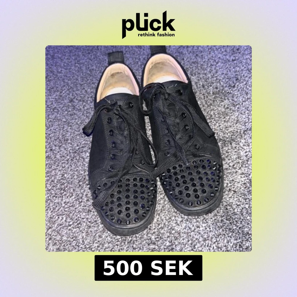Snygga svarta sneakers med nitar på tån och röda sulor. Skorna har snörning och en stilren design som passar perfekt för en edgy look. Äkta skor, men sulan är lite sliten där med priset. Kan också diskutera priset👍