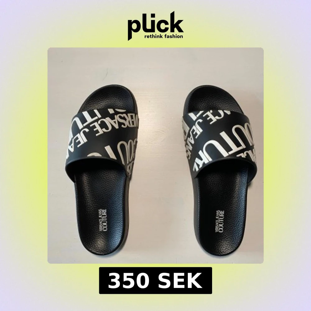 Snygga svarta sandaler med vit text på ovandelen. Sandalerna har en bekväm sula med mönstrad undersida för bra grepp. Perfekta för en avslappnad stil. Jag har storlek 43 och dom sitter lita tajt på mig. Jag gissar att dom är storlek 41-42.