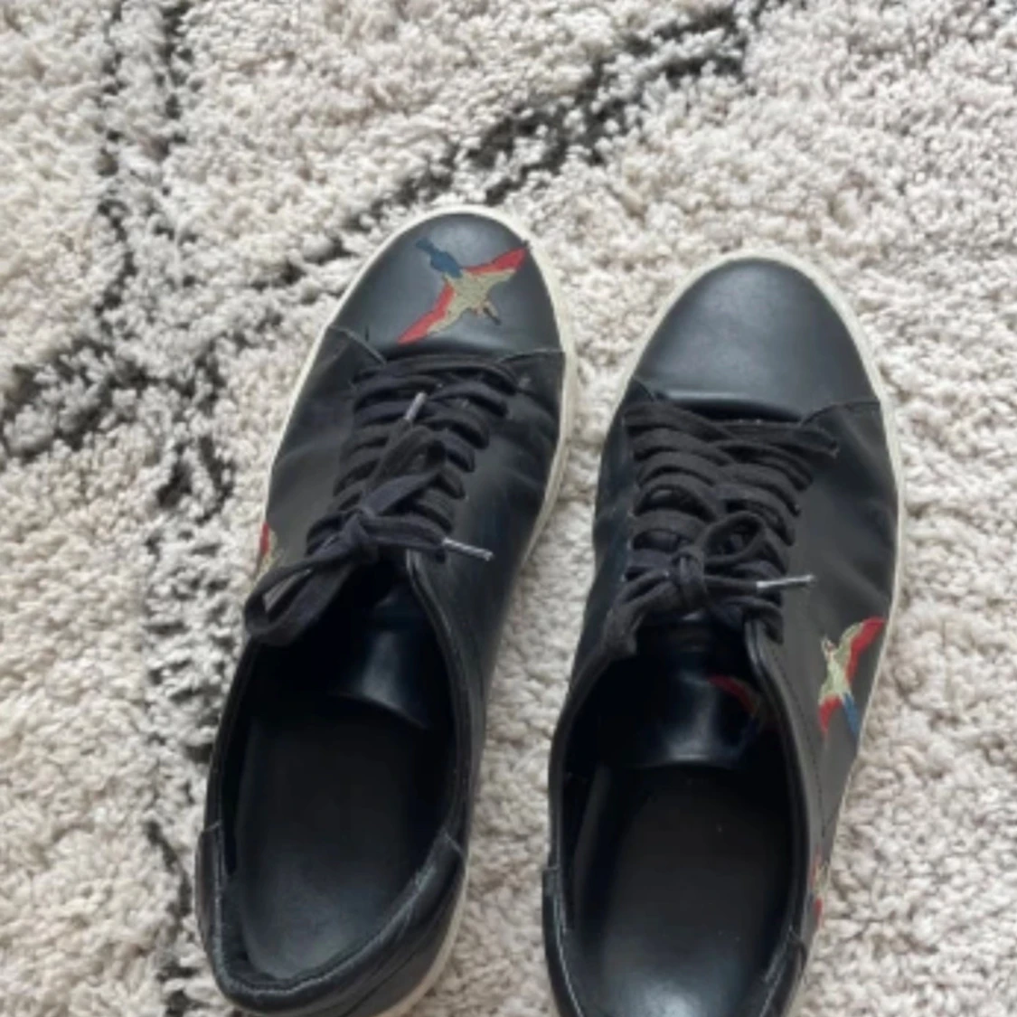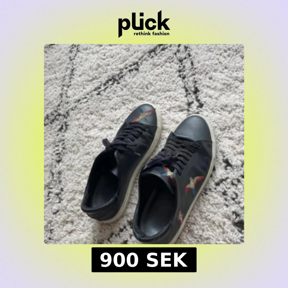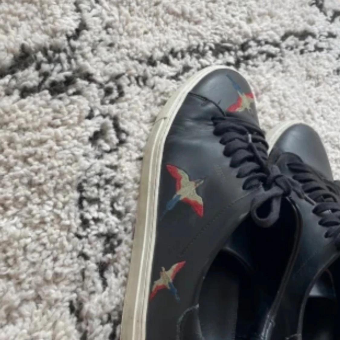 Svarta sneakers i skinn från Axel Arigato med broderade fåglar i rött, blått och beige på sidorna och tån. Klassisk vit sula och svarta skosnören. Perfekta för dig som vill ha en stilren men ändå unik look.
