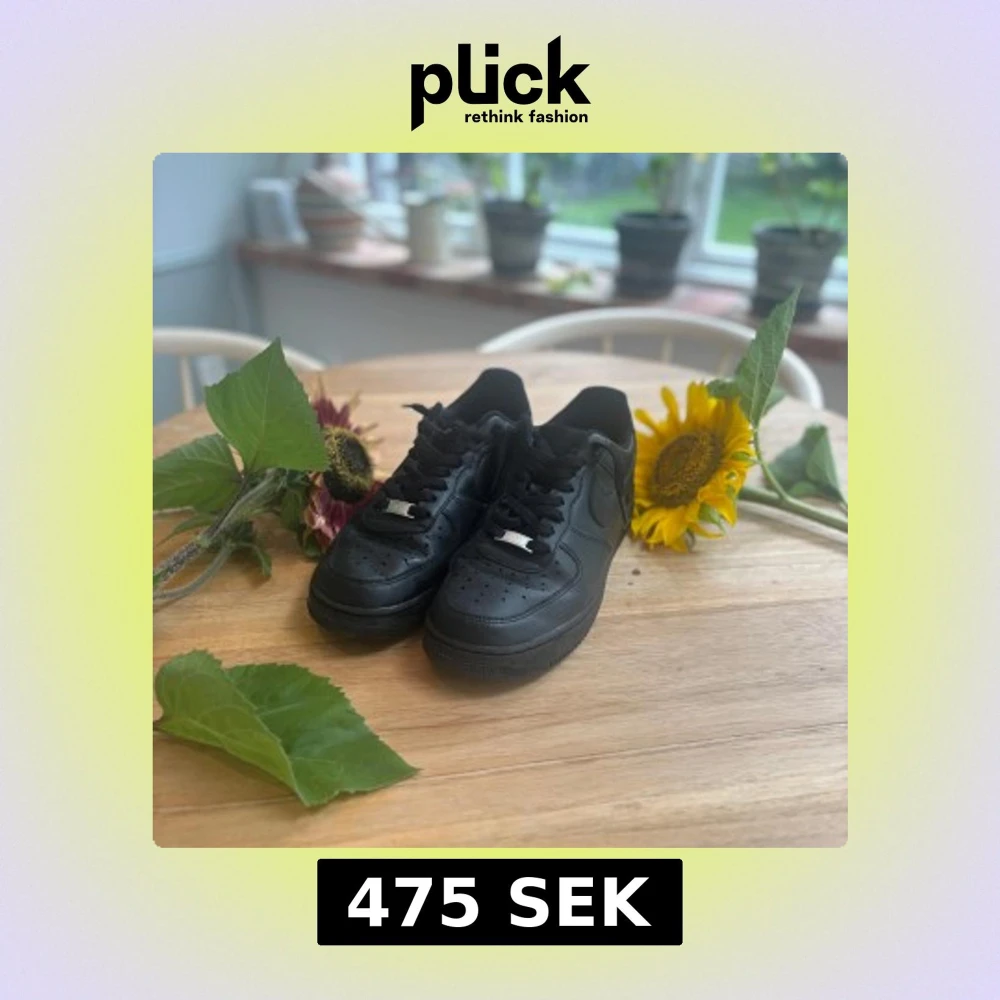 Klassiska helsvarta Nike Air Force 1 sneakers med lågt skaft. Skorna har en stilren design med rund tå, snörning och perforerade detaljer framtill. Tillverkade i skinn med en platt sula och diskret Nike-logga på sidan. Perfekta för en clean och urban look.