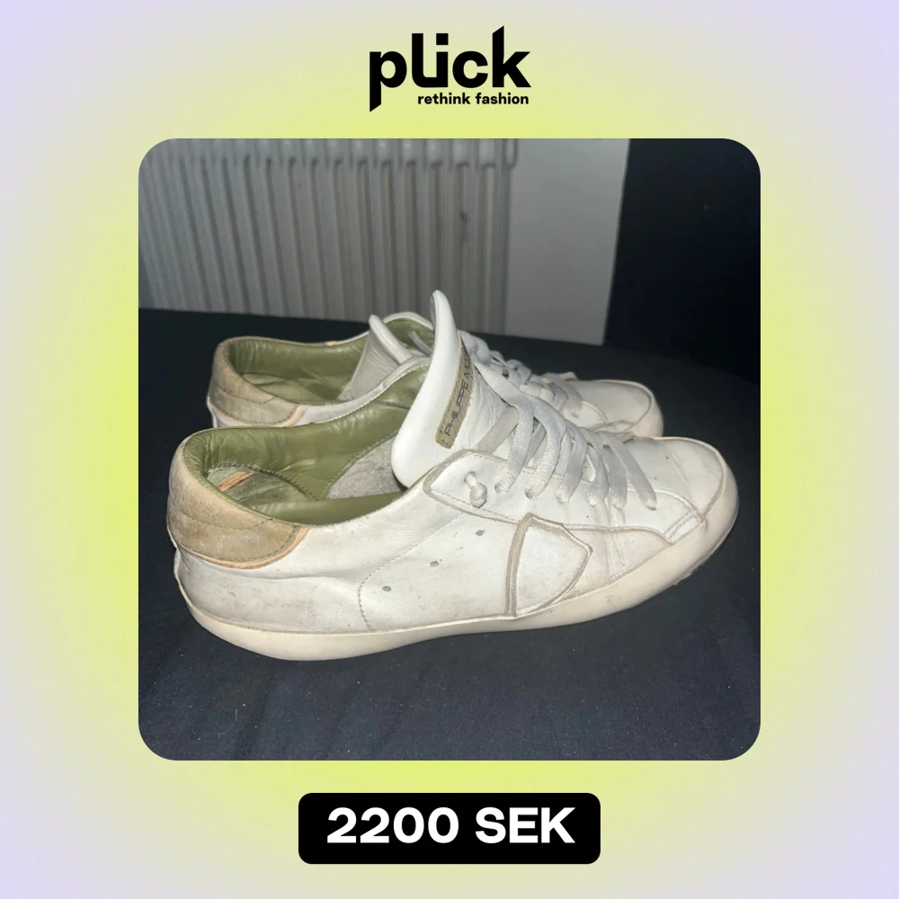 Säljer ett par vita sneakers från Philippe Model i bra skick. Skorna har en klassisk design med snörning och en bekväm passform. De är tillverkade i skinn och har en diskret logga på plösen. Perfekta för vardagsbruk och ger en perfekt look