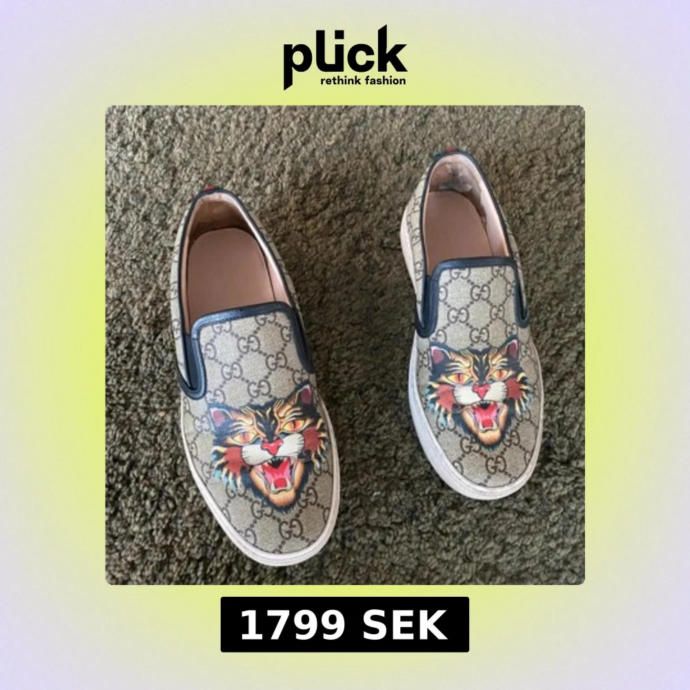 Gucci slip-on sneakers i beige canvas med klassiskt GG-mönster och färgstarkt tigertryck framtill. Skorna har vita gummisulor, svarta läderdetaljer och grönt/rött band bak. Perfekt statement-piece för dig som vill sticka ut.