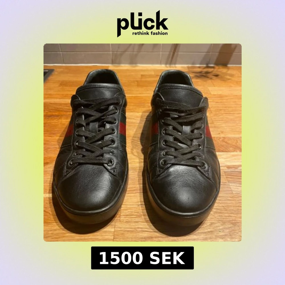 Svarta sneakers från Gucci i skinn med klassiska gröna och röda ränder på sidorna. Skorna har rund tå, svarta snören och en diskret röd detalj på hälen. Snygg och tidlös modell som passar till det mesta.