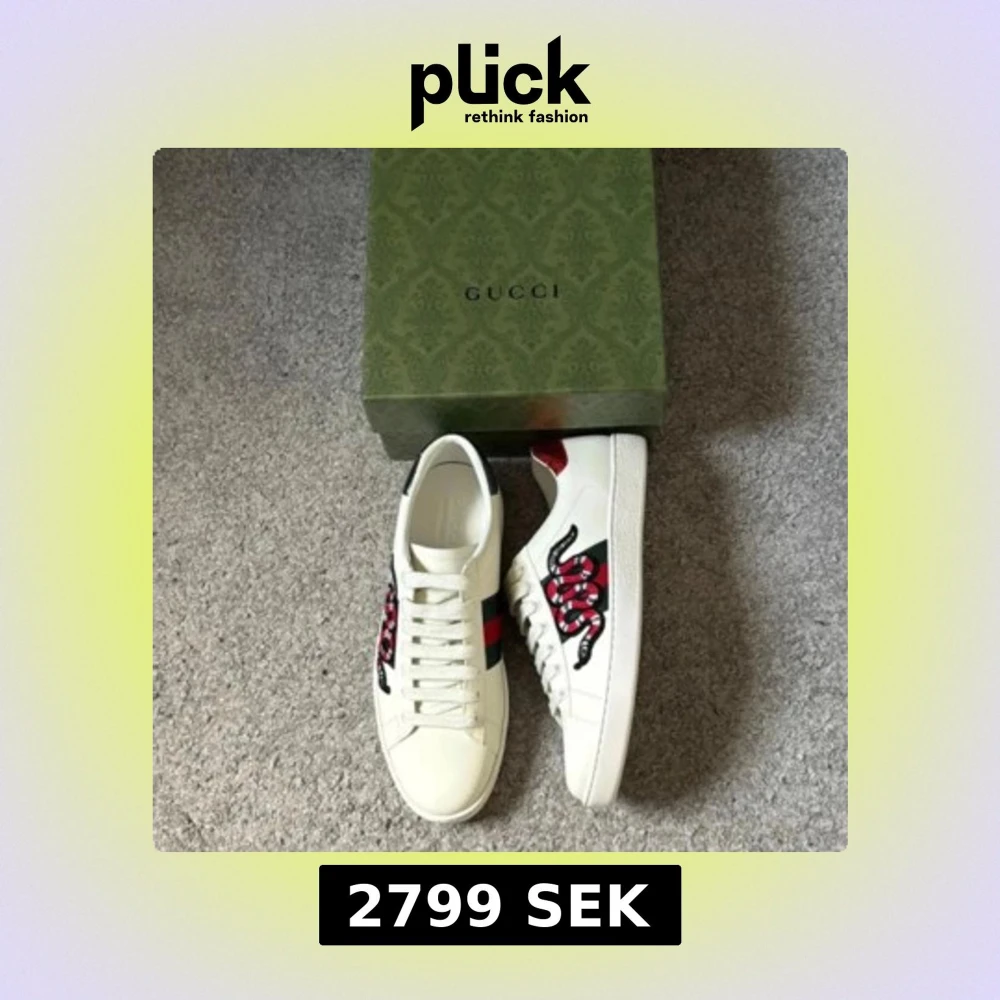 Gucci Ace sneakers i vitt skinn med ikonisk röd och svart orm brodyr på sidan, gröna och röda ränder samt metallic-detaljer i rött och grönt på hälen. Klassisk låg modell med snörning och rund tå. Perfekta för dig som vill sticka ut med lyxig streetstyle. #gucciace