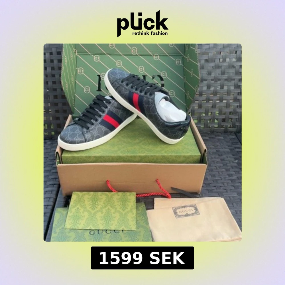 Snygga Gucci sneakers i mörkgrått med klassiskt GG-mönster, vita sulor och svarta skosnören. Sidan pryds av Guccis ikoniska röd-blå rand. Skorna är i textil och skinn, med rund tå och platt sula. Perfekta för dig som vill sticka ut med lyxig streetstyle.
