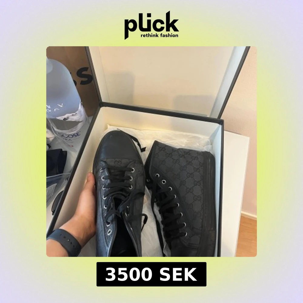 Säljer ett par svarta höga sneakers från Gucci med klassiskt GG-mönster på sidan. Skorna har snörning, rund tå och platt sula. Materialet är en mix av textil och skinn, med metallöglor för snörningen. Perfekt för dig som vill ha en lyxig och stilren look.