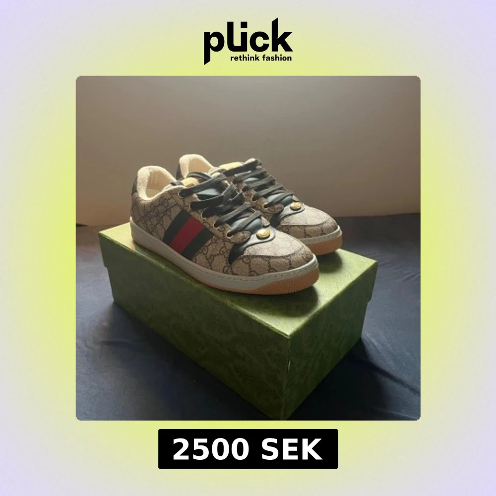 Snygga Gucci sneakers med klassiskt GG-monogram i beige och brunt. Skorna har svarta snören, detaljer i svart skinn och den ikoniska gröna och röda randen på sidan. Gummisula i ljusbrunt och guldfärgade Gucci-loggor på tungan och framtill. Perfekt för dig som vill sticka ut. Kan gå ner i pris vid snabbköp