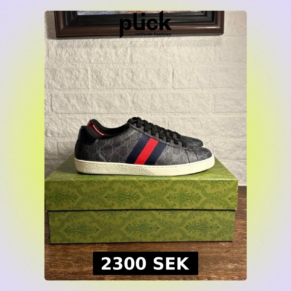 Säljer ett par snygga Gucci sneakers i mörkgrått med klassiskt GG-mönster och breda ränder i rött och marinblått på sidan. Skorna har vit platt sula med Gucci-logga undertill och svarta skosnören. Materialet är canvas med detaljer i skinn.