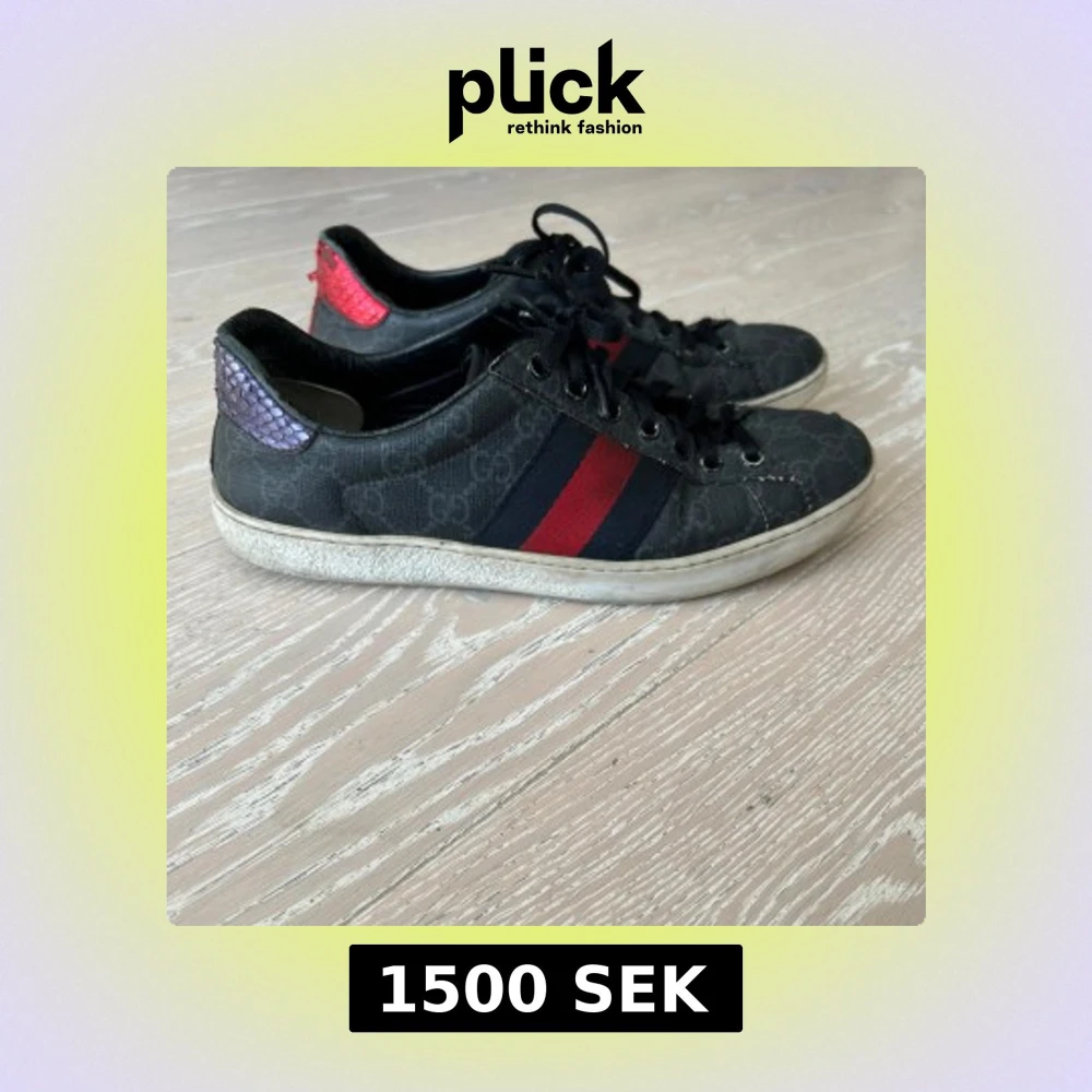Svarta Gucci sneakers med GG-monogram, klassiska röd- och blå ränder på sidan och snörning. Baksidan har en röd och en lila metallic detalj i ormskinnsmönster. Snygg och unik design som sticker ut.