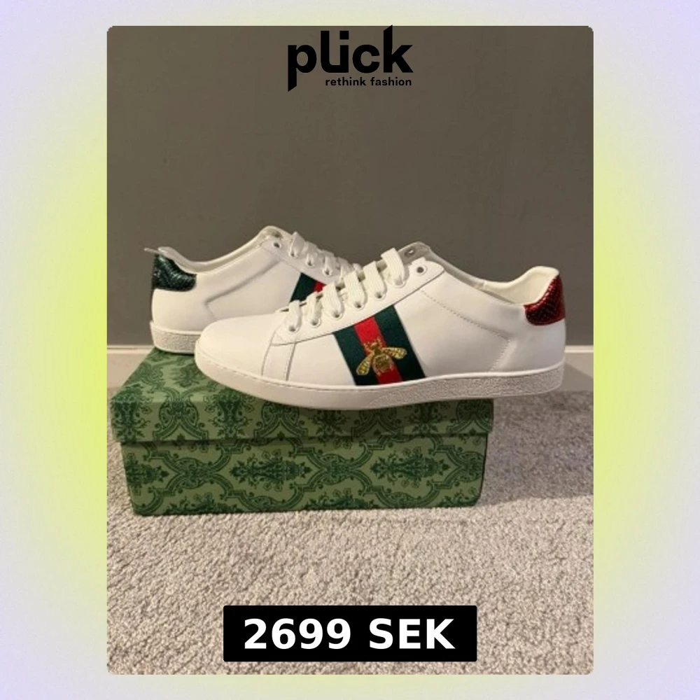 Säljer ett par vita sneakers från Gucci med klassiska gröna och röda ränder på sidan och en guldbroderad bi. Baksidan har metallicröd och metallicgrön hälflik i ormmönstrat skinn. Skorna har snörning och platt sula.