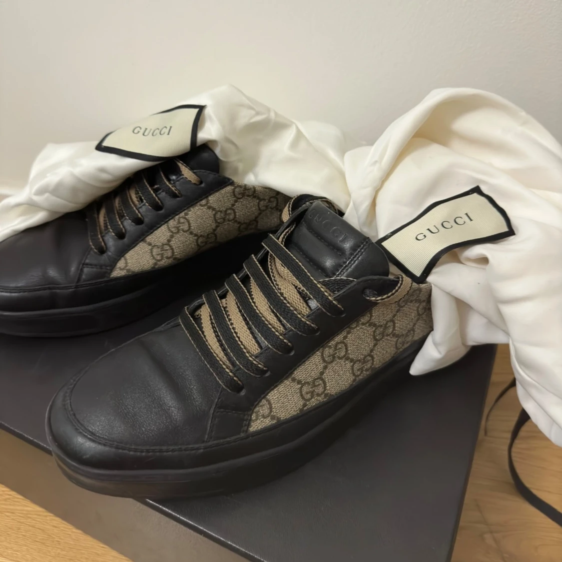 Mycket fina Gucci skor som passar in vid fina tillfällen. Storleken är 42,5 och inga stora skador alls. Använd ett par tillfällen vid bröllop. Men har köpt in nya finskor så dessa har legat i garderoben ett tag nu.