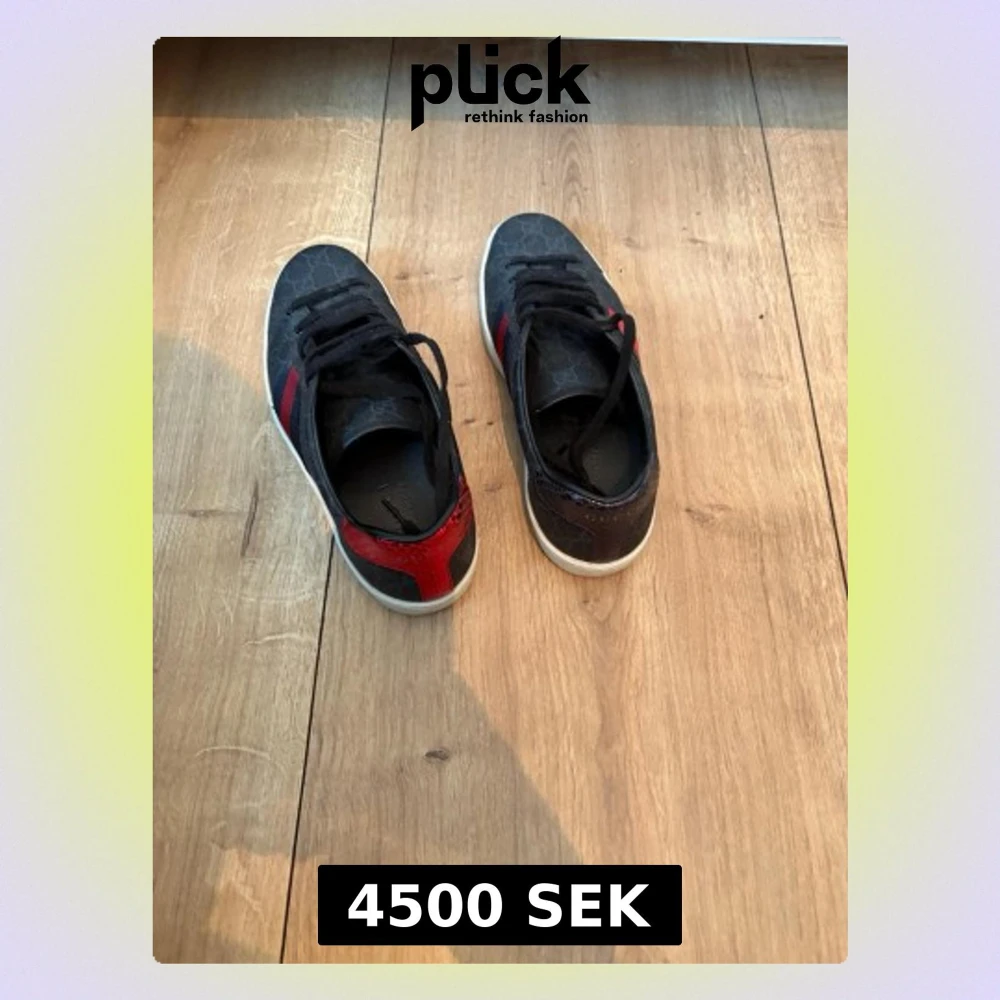 Säljer mina svarta Gucci sneakers med klassiskt GG-mönster. De har röda och blå ränder på sidorna och röd samt blå detalj i ormskinn-look på hälen. Tillverkade i skinn och textil, med Gucci-märkning både på insidan och undersidan. Följer med ett par extra Gucci-skosnören (oanvända). Storlek 40-41 (amerikansk storlek 6 1/2). Skorna är i mycket bra skick, använda varsamt ca 5 gånger. Köpta på Guccibutiken på Birger Jarls Gatan i Stockholm för 8 000 kr.