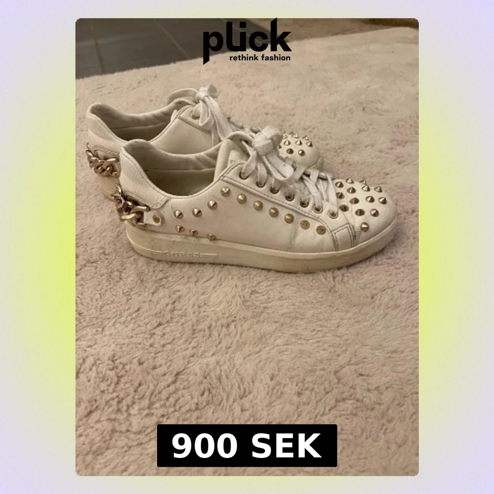 Snygga vita sneakers från Guess med guldiga nitar över hela skon och en chunky guldkedja bak. Skorna har snörning och är i skinn, med platt sula och rund tå. Perfekta för dig som vill sticka ut med detaljer och cool design.