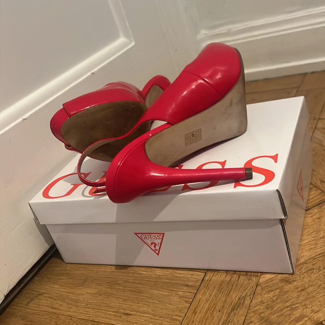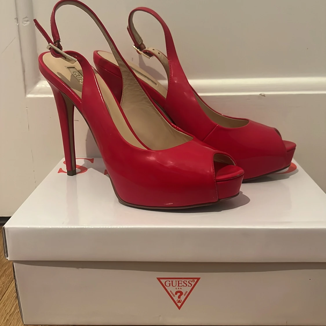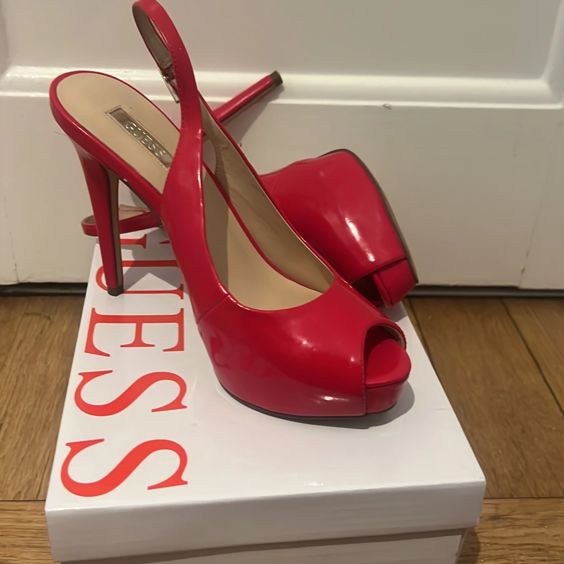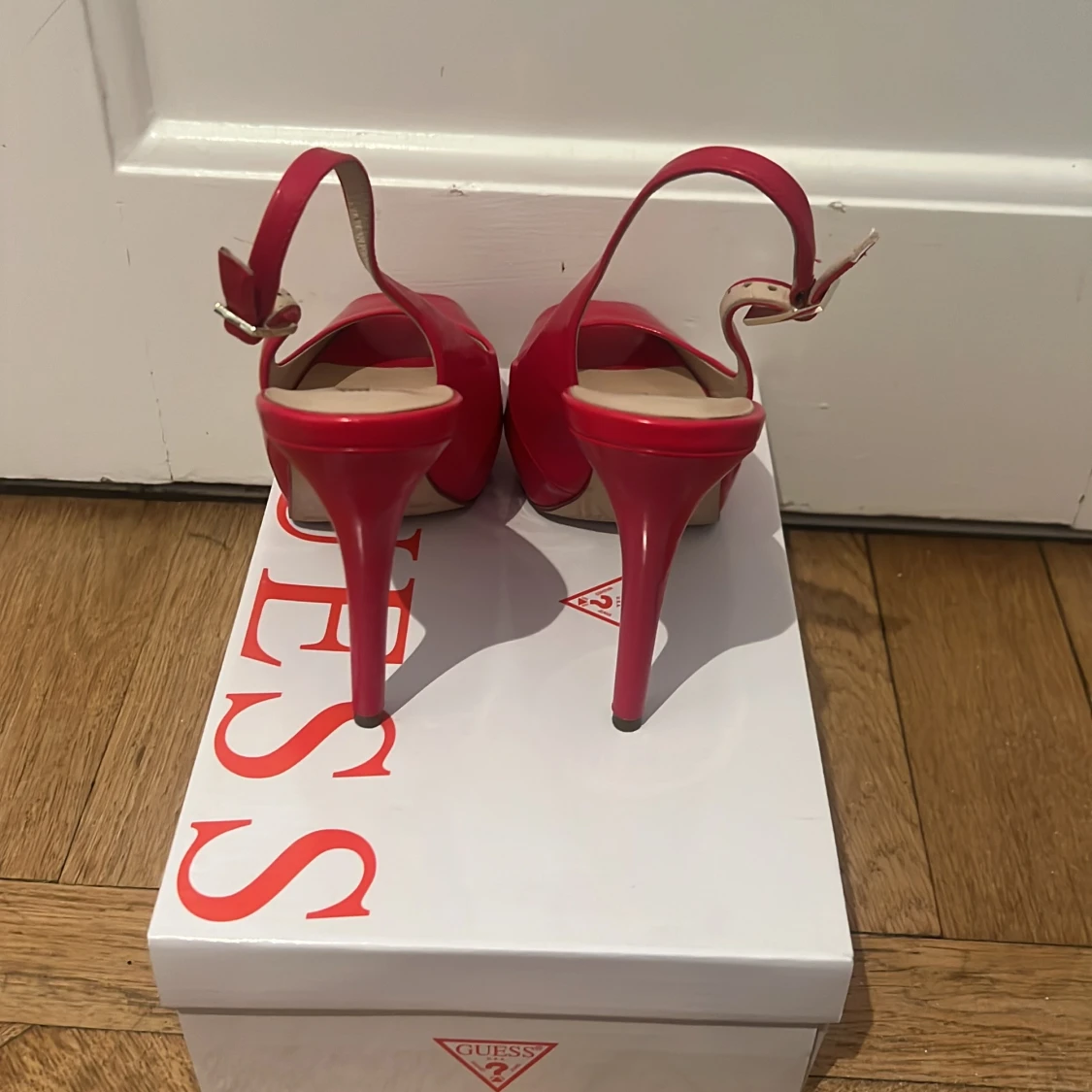 Snygga röda klackskor från Guess med öppen tå och justerbar rem runt hälen. Perfekta för att ge en färgklick till din outfit. Skorna har en elegant design med hög klack.