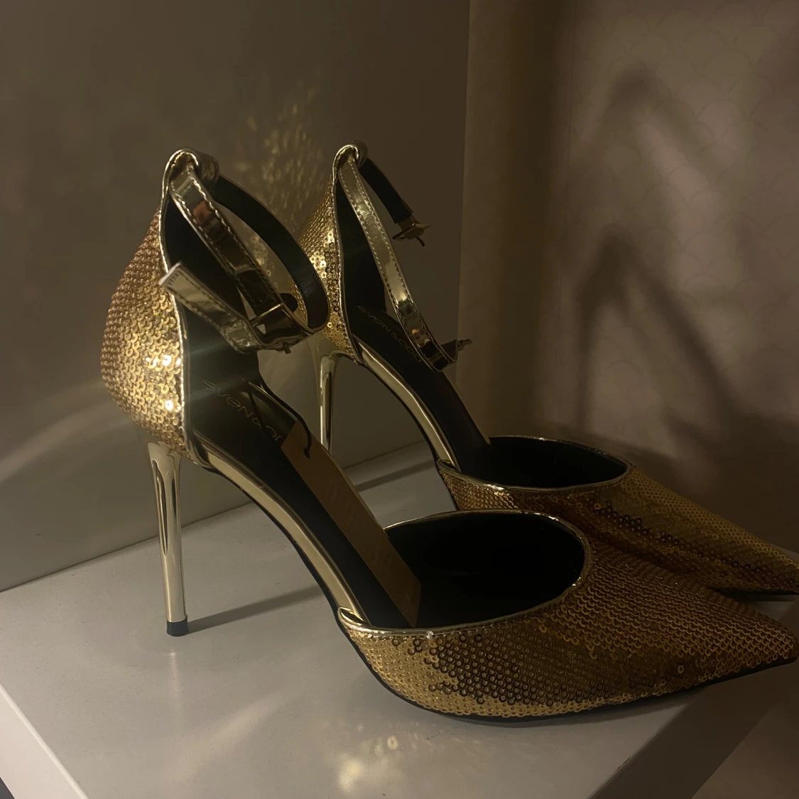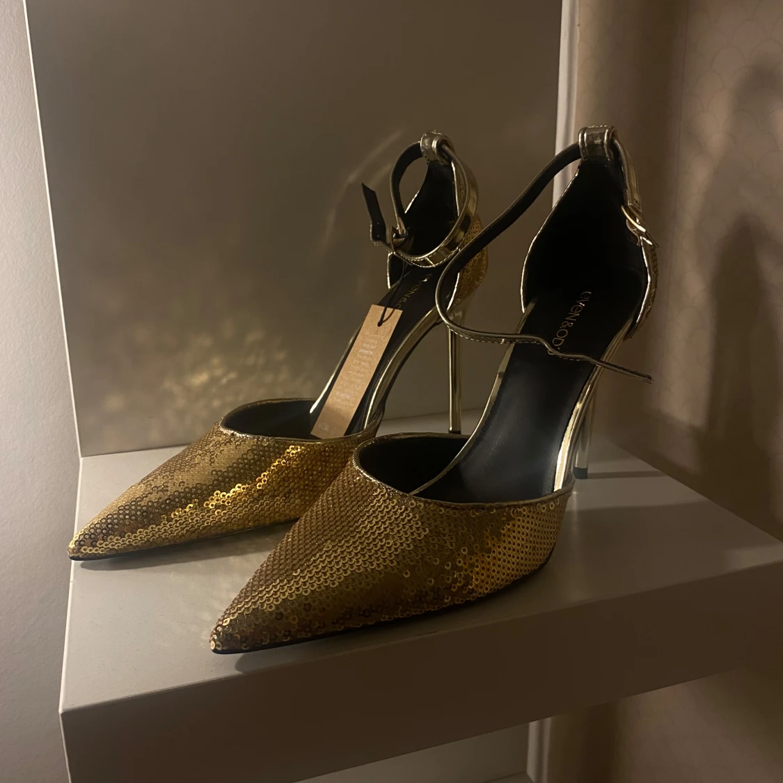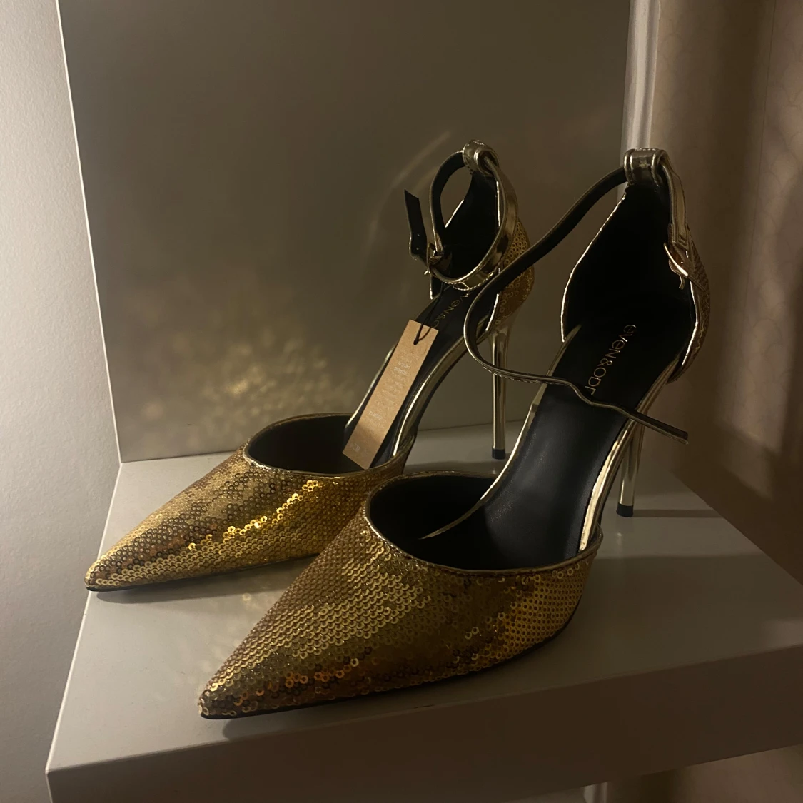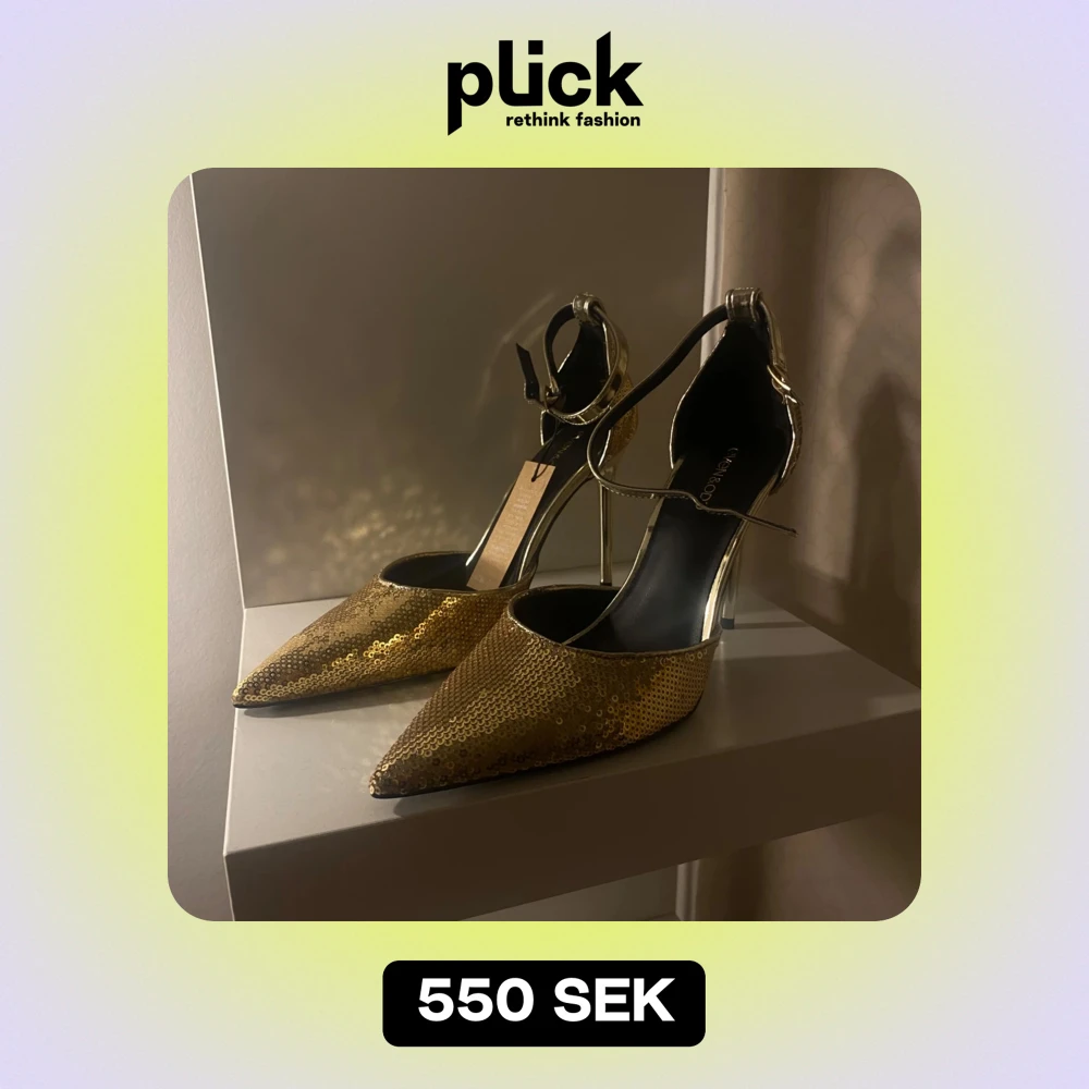 Snygga guldiga pumps med paljetter och spetsig tå. Perfekta för festliga tillfällen! De har en elegant klack och justerbar rem runt ankeln för extra komfort och stil. Skorna är i mycket bra skick och redo att glittra på nästa event.