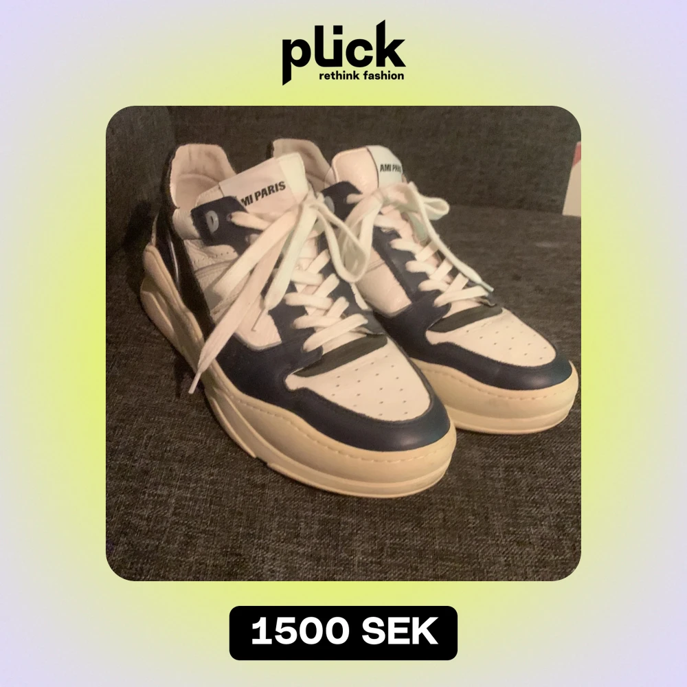 Säljer ett par snygga svartvita sneakers från AMI Paris i storlek 44. Skorna är i mycket bra skick och har en stilren design med snörning. Perfekta för både vardag och fest! Tillverkade i Portugal med kärlek.