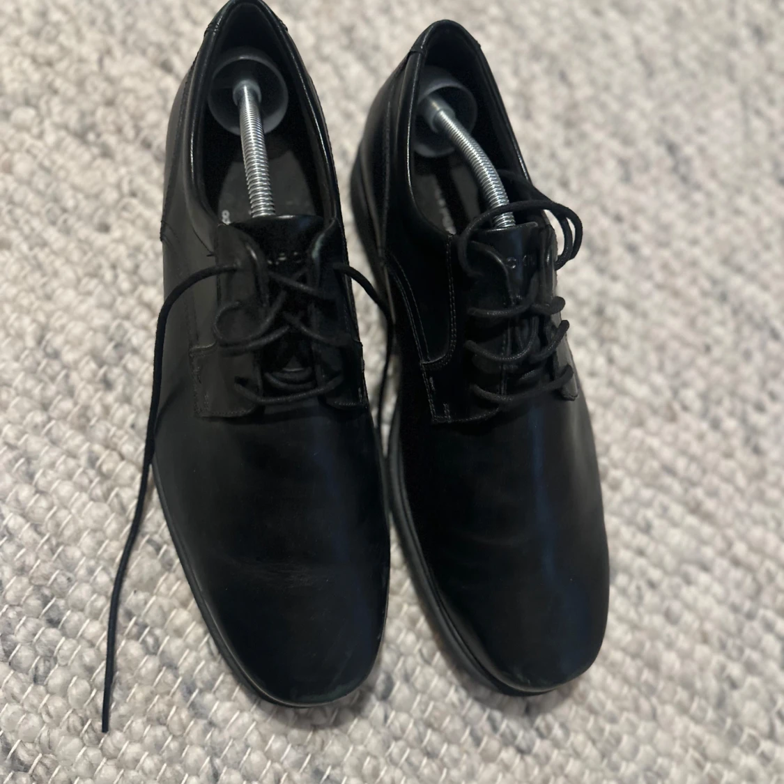Säljer ett par stilrena svarta skinnskor från Rockport i herrstorlek 44. Skorna har klassisk snörning och en bekväm sula med bra grepp. Perfekta för både vardag och festliga tillfällen. De är i mycket bra skick och redo för nya äventyr!