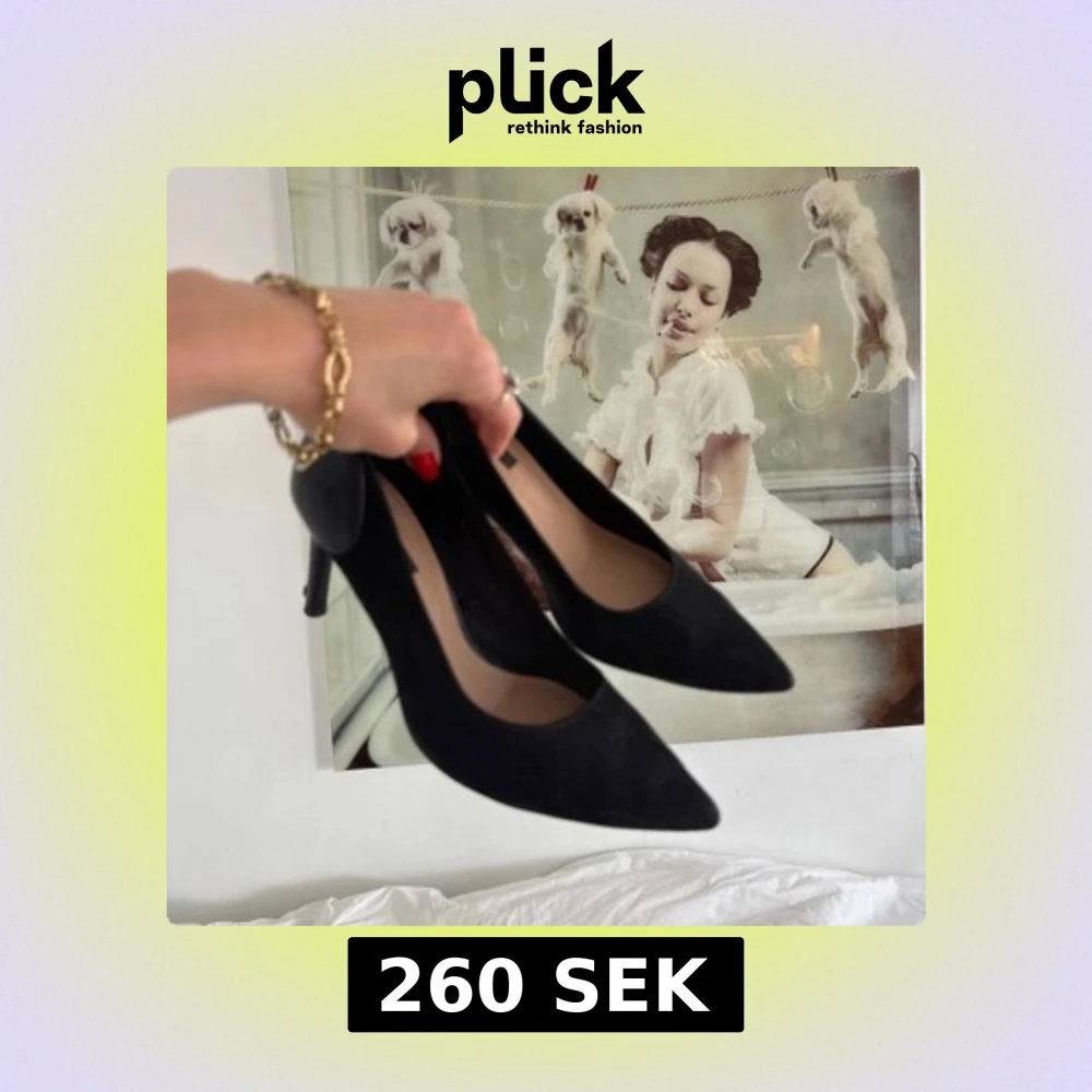 Snygga svarta pumps från H&M med spetsig tå och hög klack. Skorna är gjorda i mocka och skinn, vilket ger en stilren och klassisk look. Perfekta för dig som gillar minimalistisk stil och vill ha ett par eleganta klackar i garderoben.