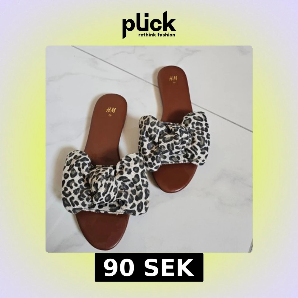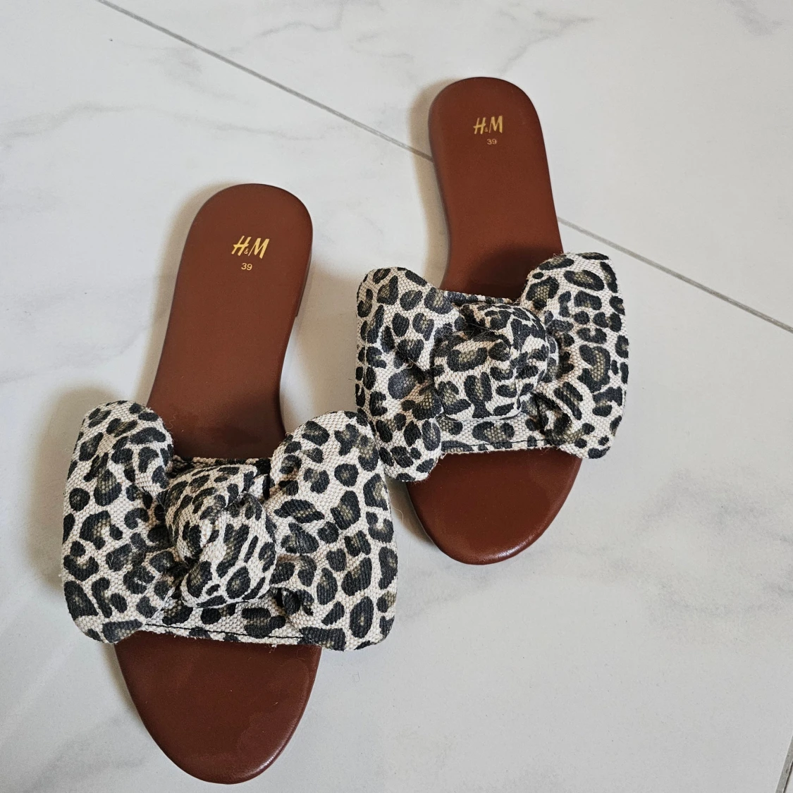 Säljer ett par sandaler från H&M i storlek 39 med breda leopardmönstrade band och stor rosett framtill. Sulan är brun och platt, och ovandelen är i textilmaterial. Perfekta för att ge outfiten en cool touch.