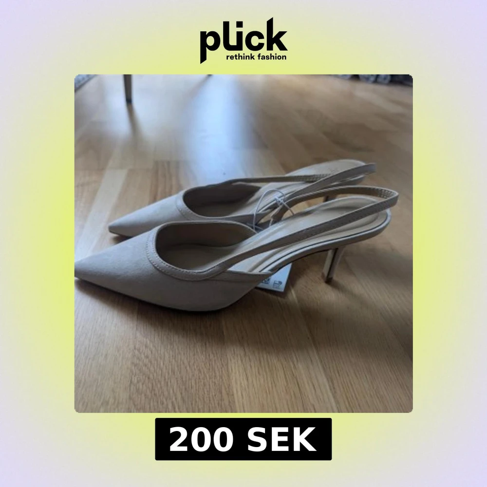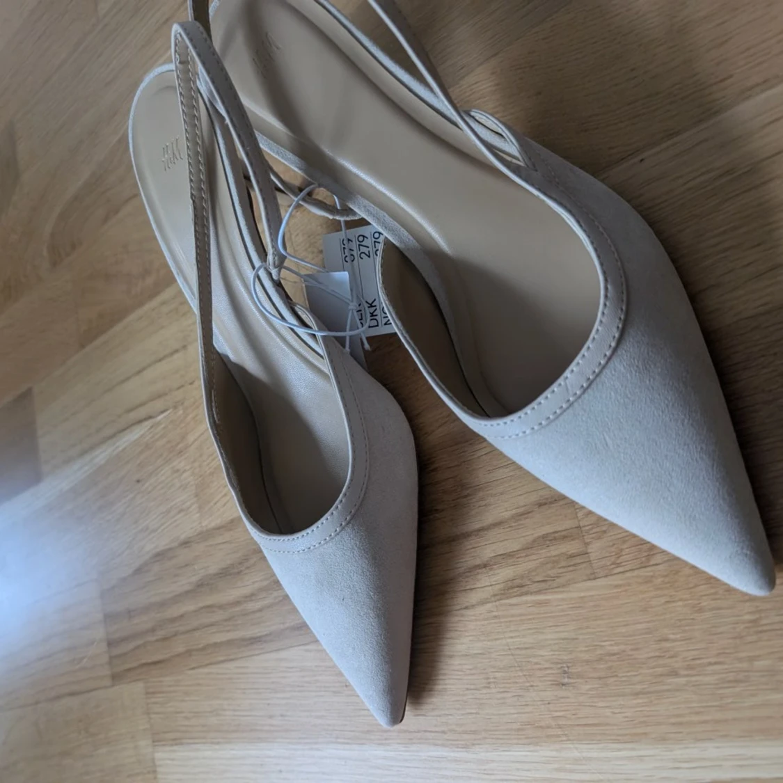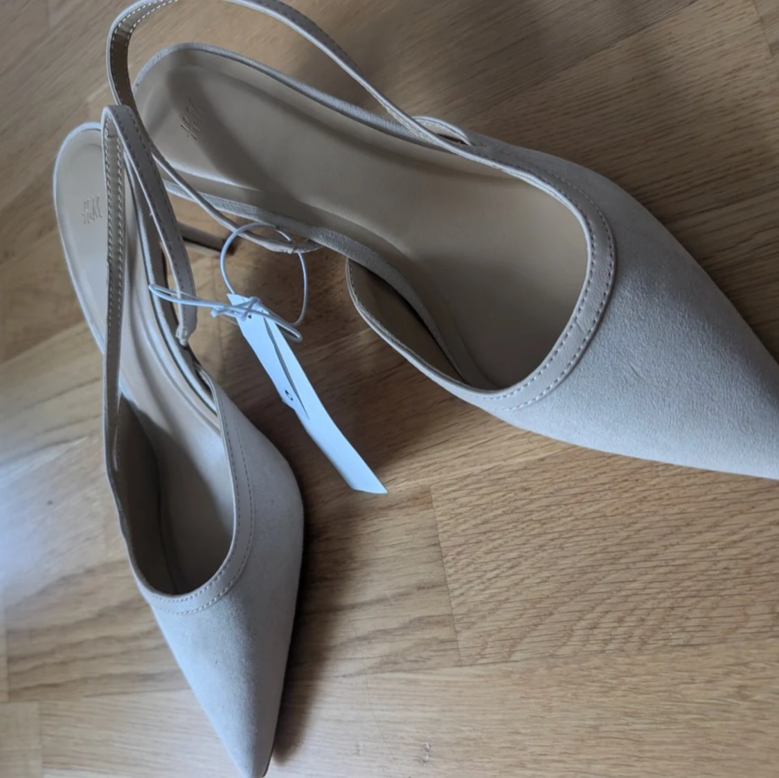 Stilrena pumps i beige mockaimitation från H&M med spetsig tå och smal klack. Skorna har öppen häl med smal rem och en elegant siluett som ger en trendig look. Perfekta för dig som gillar minimalistisk och chic stil.