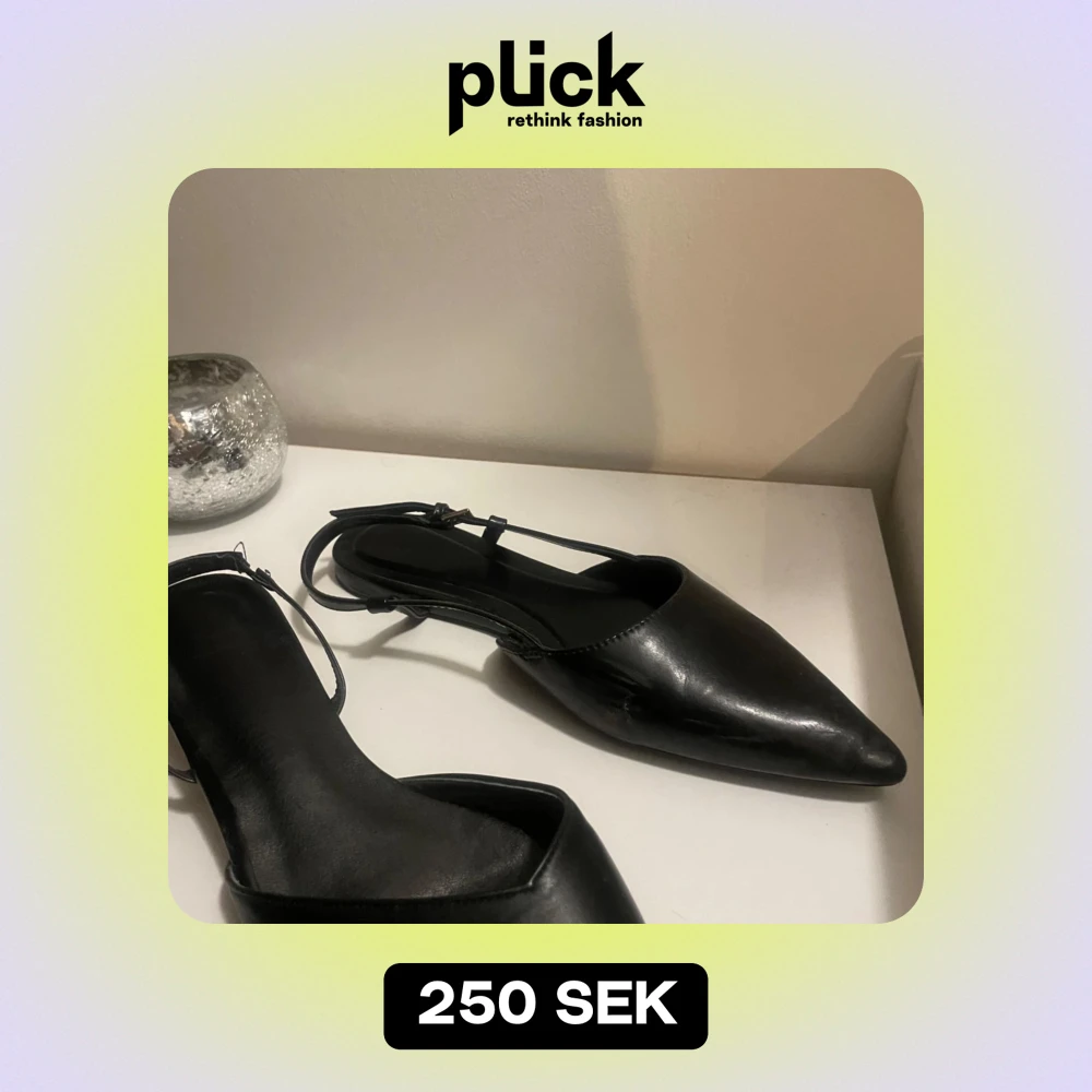 Snygga svarta ballerinaskor i skinn med spetsig tå och smala remmar. Perfekta för både vardag och fest. De har en elegant och stilren design som passar till många olika outfits.