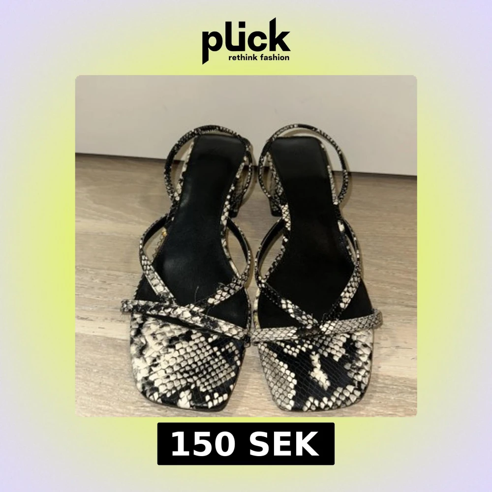 Trendiga sandaler med svart och vitt ormmönster, fyrkantig tå och smala remmar. Skorna har en stabil, låg klack och öppen tå, perfekt för att lyfta din outfit. Snyggt och edgy val för dig som gillar att sticka ut.