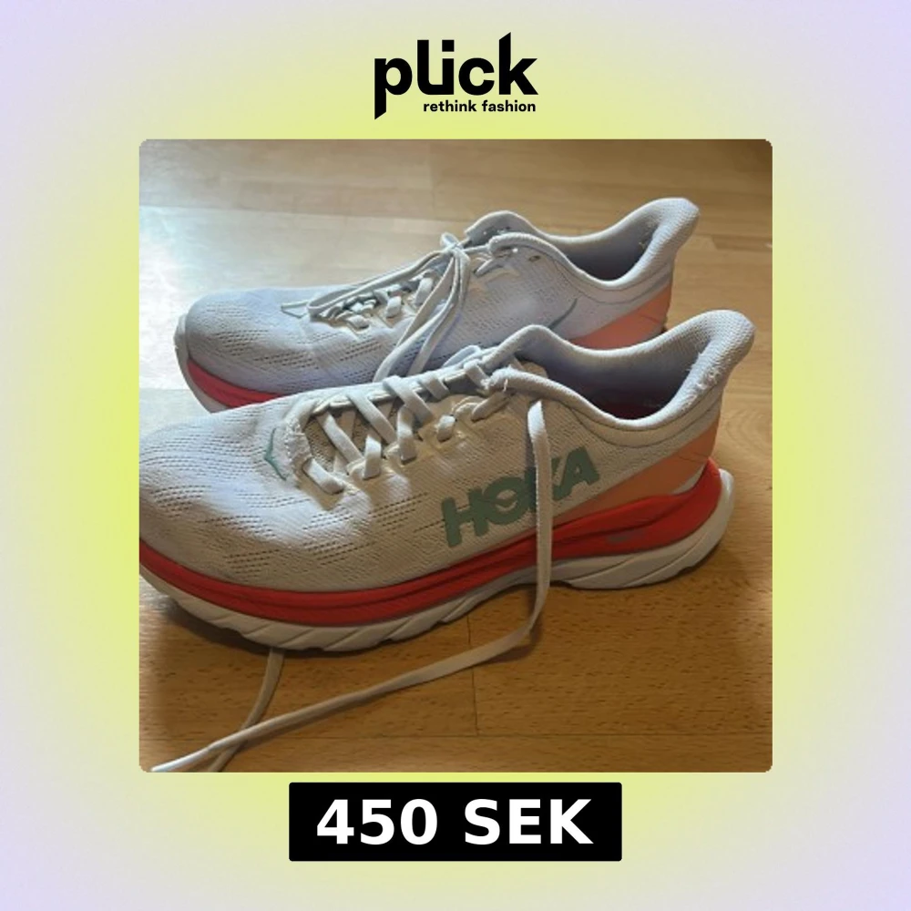 Säljer ett par vita Hoka löparskor med turkos logga och detaljer i korall och orange. Skorna har snörning och en tjock, dämpad sula som ger bra stöd vid löpning. Perfekta för dig som gillar att springa långt och vill ha bekväma skor.
