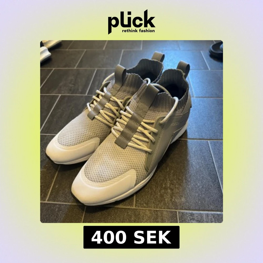 Snygga grå sneakers från Hugo med vit sula och stickad, ribbad kant runt ankeln. Ovandelen är i mesh och syntet, med tydlig logga bak och på sidan. Skorna har snörning och dragflikar både fram och bak för enkel påtagning. Perfekta för en clean och modern look.