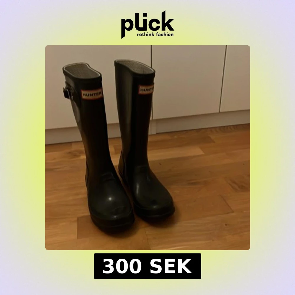 Säljer ett par klassiska svarta Hunter stövlar i gummi med högt skaft och justerbart spänne på sidan. Perfekta för regniga dagar och festivaler. Hunter-logga framtill och reflexdetalj baktill för extra synlighet.