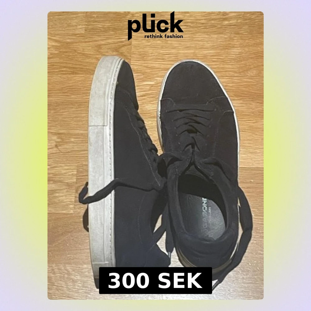 Säljer ett par stilrena svarta sneakers från vagabond med vit sula och klassisk snörning. Ovandelen är i mocka och de har en rund tå samt platt sula. Perfekta för dig som gillar enkel och clean stil.