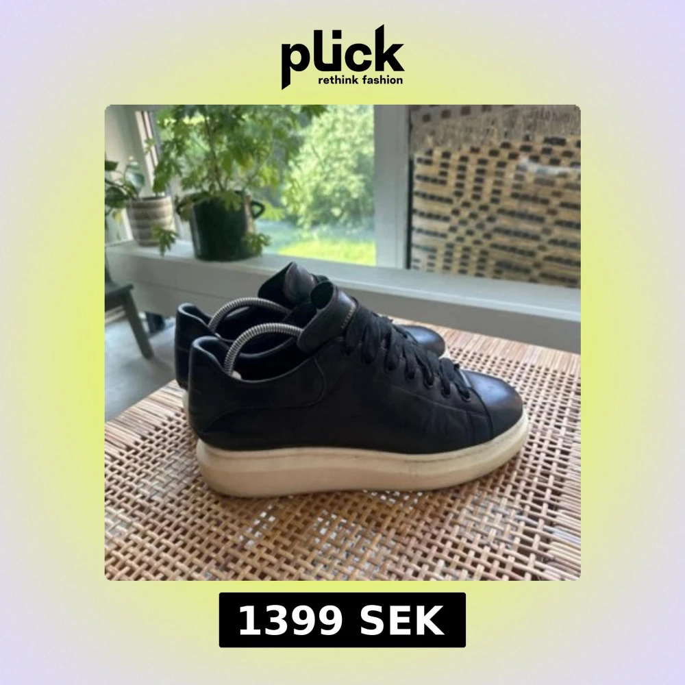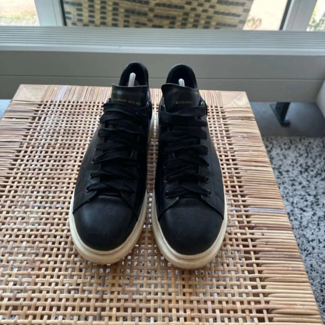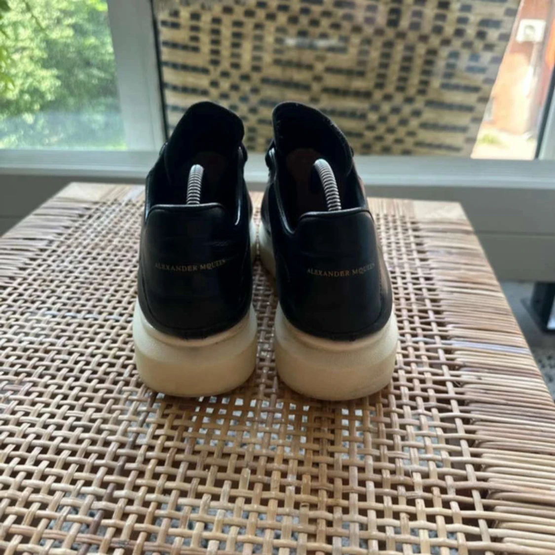 Svarta sneakers från Alexander McQueen med chunky vit platt sula och klassisk snörning. Skorna är i skinn och har rund tå samt diskret logga bak på hälen. Perfekta för dig som gillar stilrena och trendiga sneakers med extra höjd.