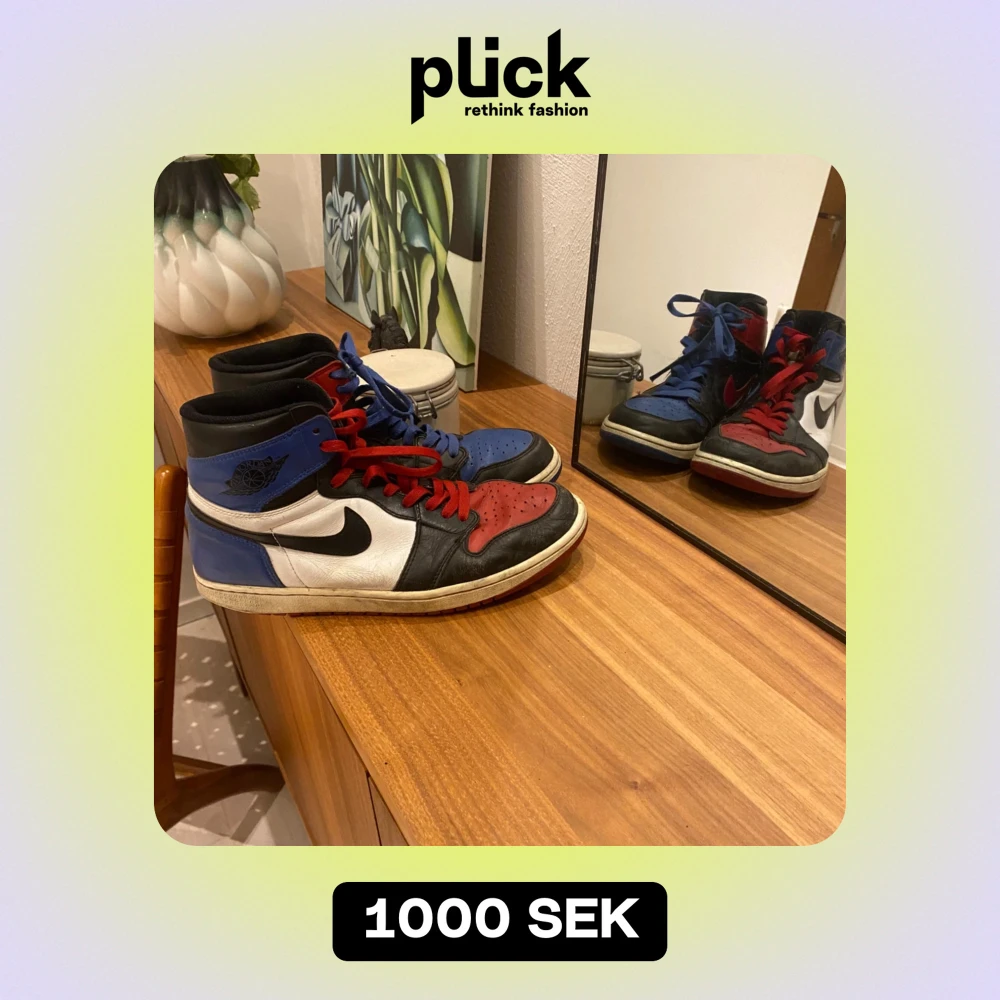 Säljer mina Jordan 1 top 3 till ett mycket bra pris Dem är använda o lite slitna och finns box till dem också