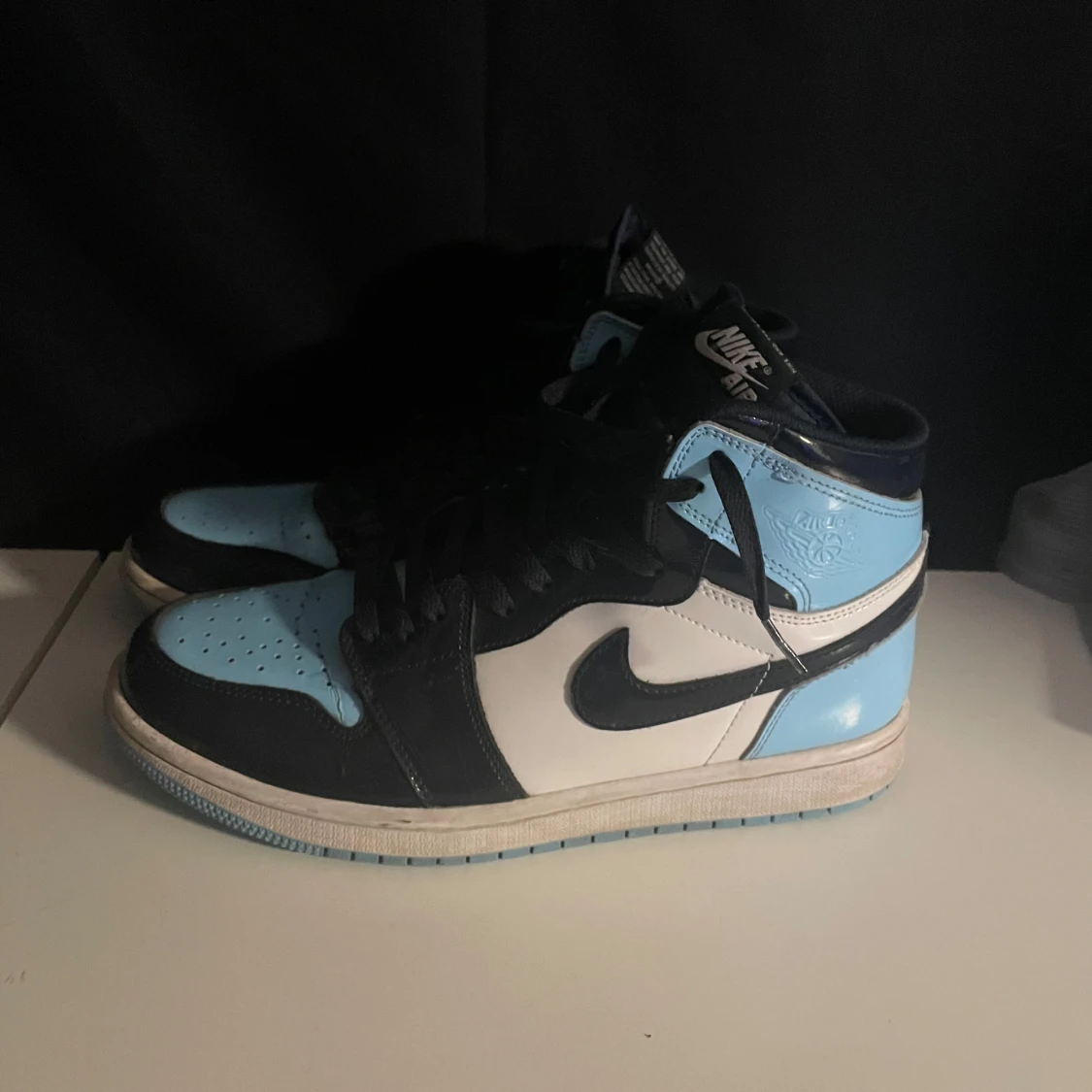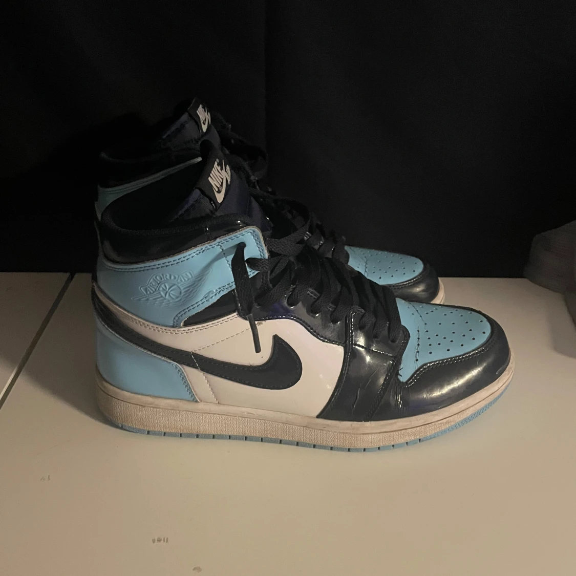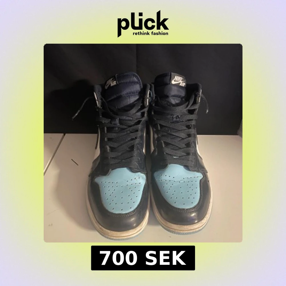 Snygga Nike Air Jordans med en fräsch färgkombination av blått, svart och vitt. Skorna har en klassisk hög design med snörning och rund tå. Perfekta för dig som vill ha en stilren och sportig look.