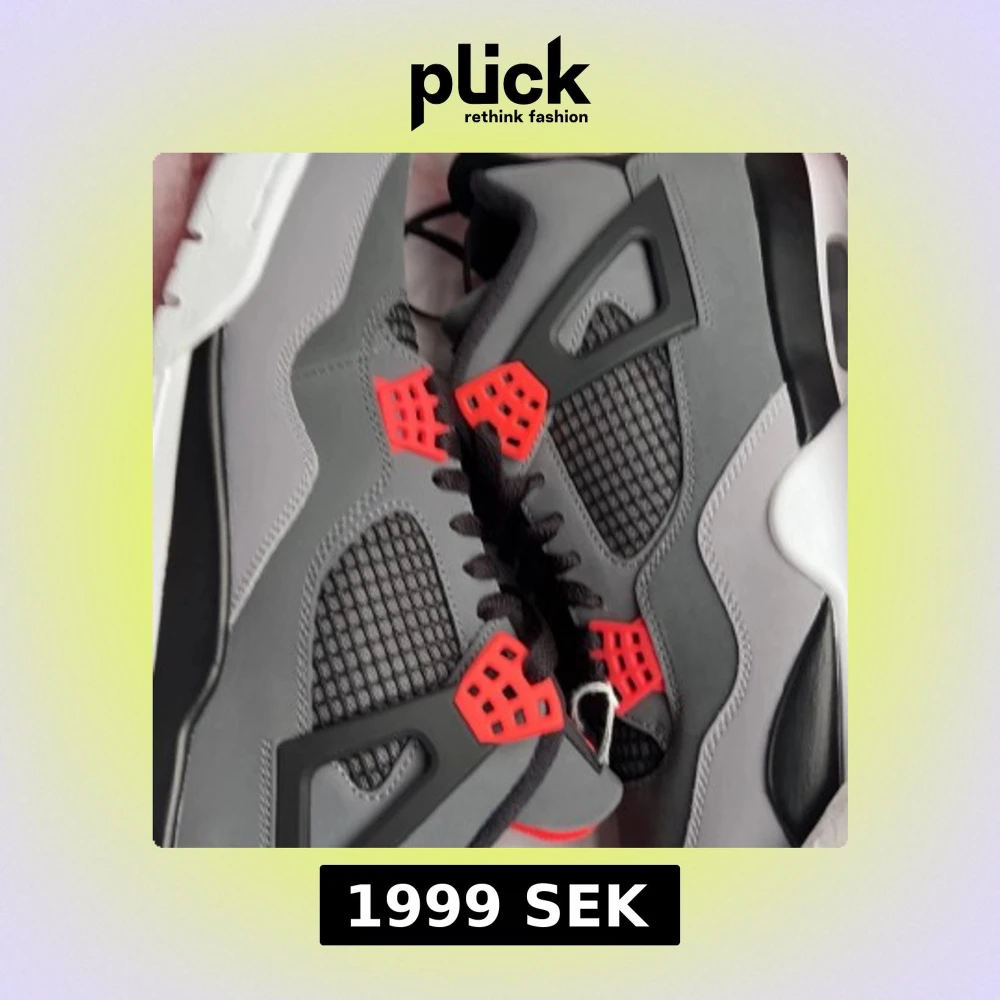 Box följer med !!Snygga Nike Air Jordan 4 Retro sneakers i grått och svart med röda detaljer. Skorna har meshpaneler, svarta snören och en vit sula med synlig Air-enhet. Perfekta för dig som gillar streetwear och vill sticka ut med klassisk Jordan-stil.
