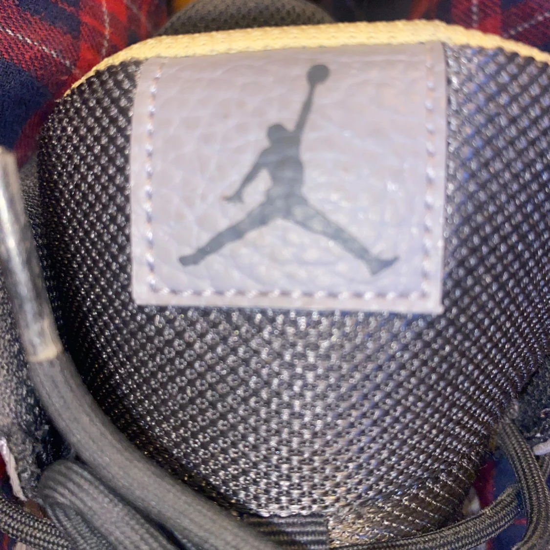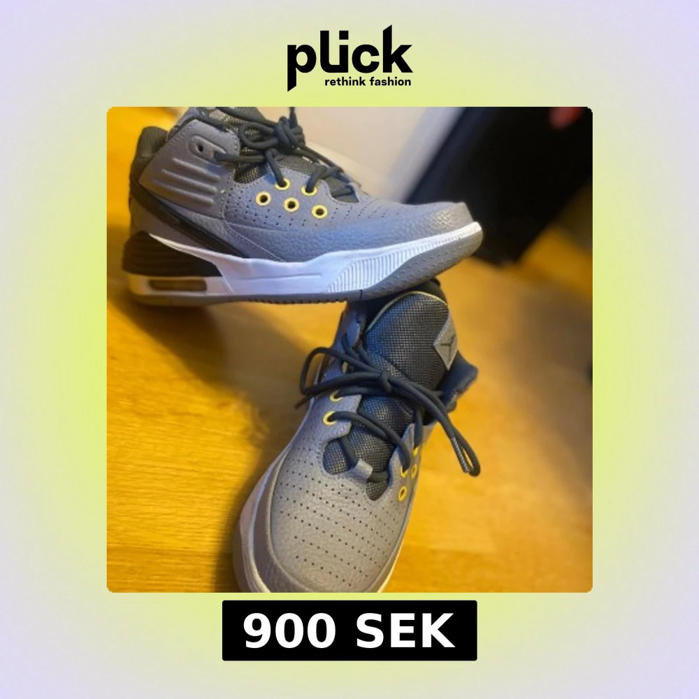 Säljer ett par gråa Nike Air Jordans sneakers med snygga gula detaljer och svart snörning. Skorna har perforerad tå, vit och svart sula samt klassisk Jumpman-logga på plösen. Perfekta för dig som gillar streetwear och sportig stil. Ny pris ligger på 1200kr pris kan diskuteras