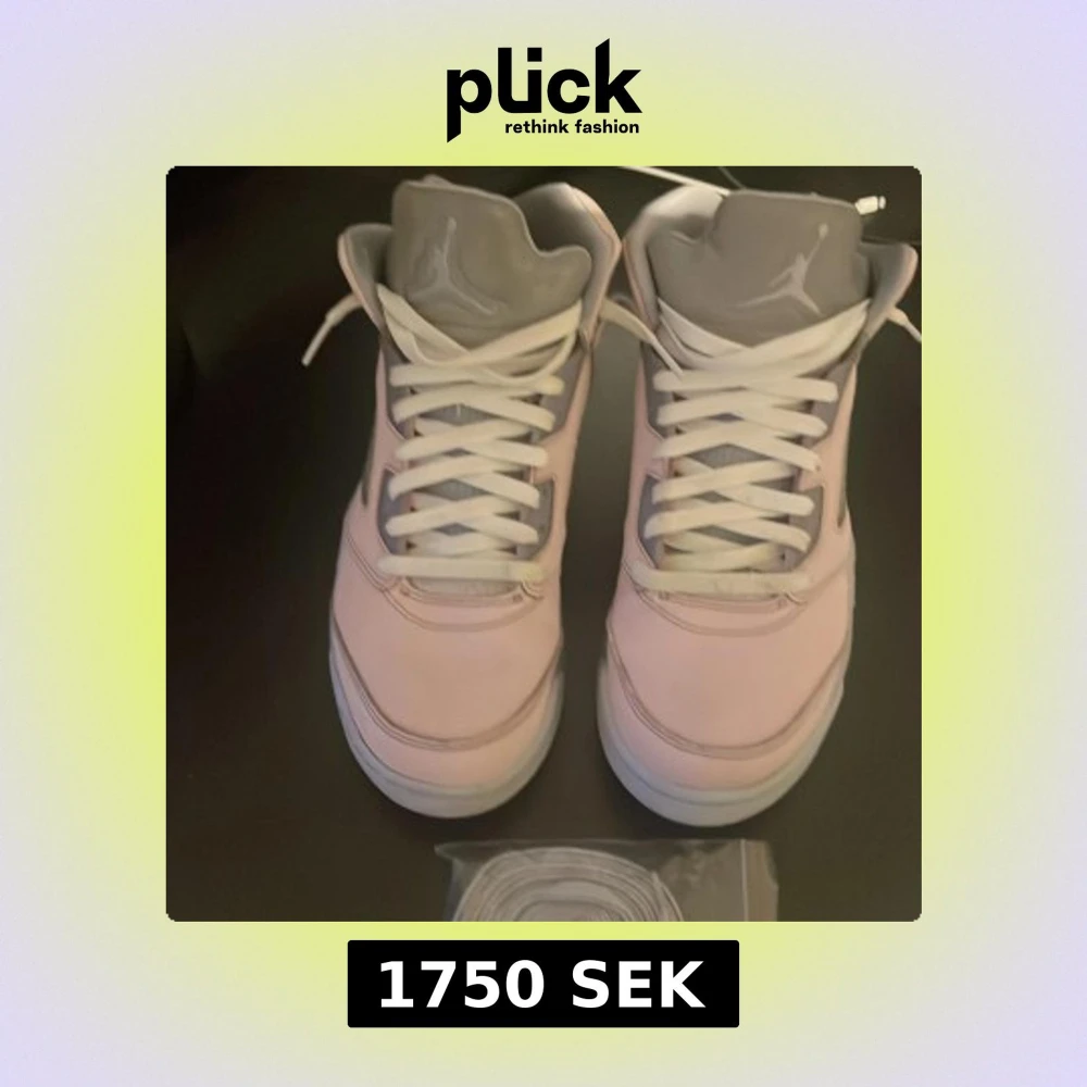 Säljer ett par Nike Air Jordans 5 Retro i ljusrosa med grå detaljer och vit sula. Skorna har klassisk snörning ( detta är inte orginal skosnörena men man får såklart med dem också, fråga bara så skickar jag bild på de också), meshpaneler på sidorna och en genomskinlig yttersula. Perfekta för dig som vill sticka ut med stilrena sneakers. Jag har inte lådan då jag köpte dessa när jag var i usa men hade inte plats att ta med lådan hem! Priset är inte hugget i sten!