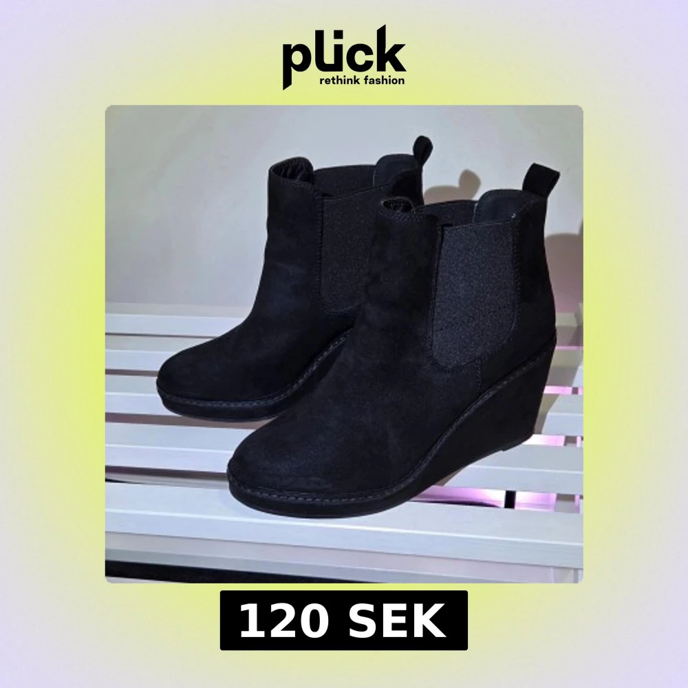 Snygga svarta chelsea boots från New Look med kilklack och rund tå. Nästintill nya. Skorna är gjorda i mocka och har elastiska paneler på sidorna för enkel påtagning. Perfekta för dig som vill ha en stilren look med lite extra höjd. Kilklacken är ca 8 cm hög. ☆Skorna är nyimpregnerade för optimalt väderskydd och längre hållbarhet.☆