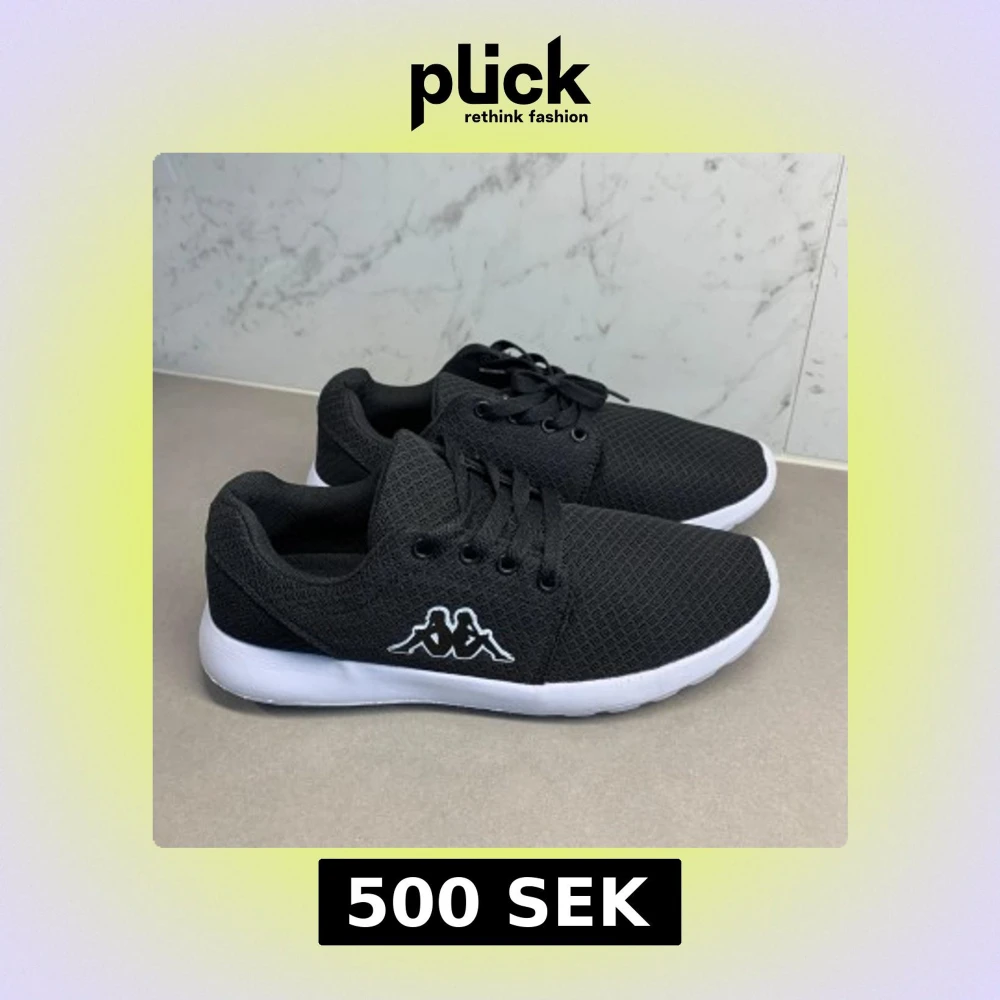 Svarta sneakers från Kappa med vit sula och klassisk Kappa-logga på sidan. Skorna har rund tå, snörning och är tillverkade i ett ventilerande syntetmaterial med meshstruktur. Perfekta för dig som gillar stilrena och sportiga skor.
