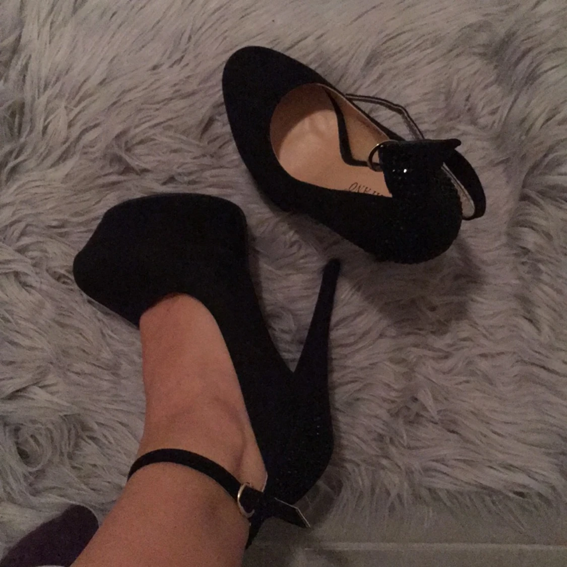 Helt nya, oanvända, tog på mig för o ta bild. Svarta med lite strass där bak. Ca 15 cm klack. Kan skickas mot att du står för portot.