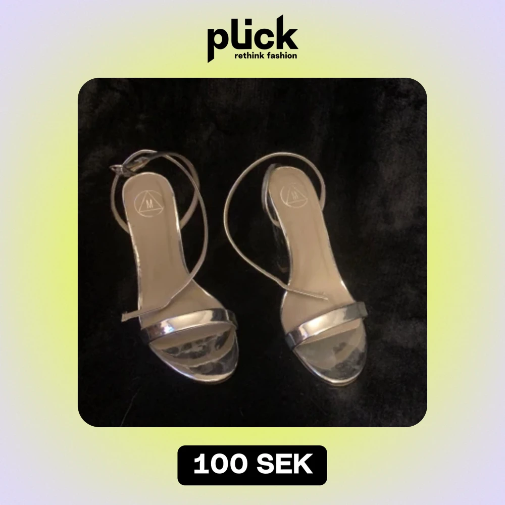 Silvriga klackskor med öppen fot. Dem är i storlek 38 och har tunna band som går runt foten. Skulle gissa på att klacken är runt 10 cm