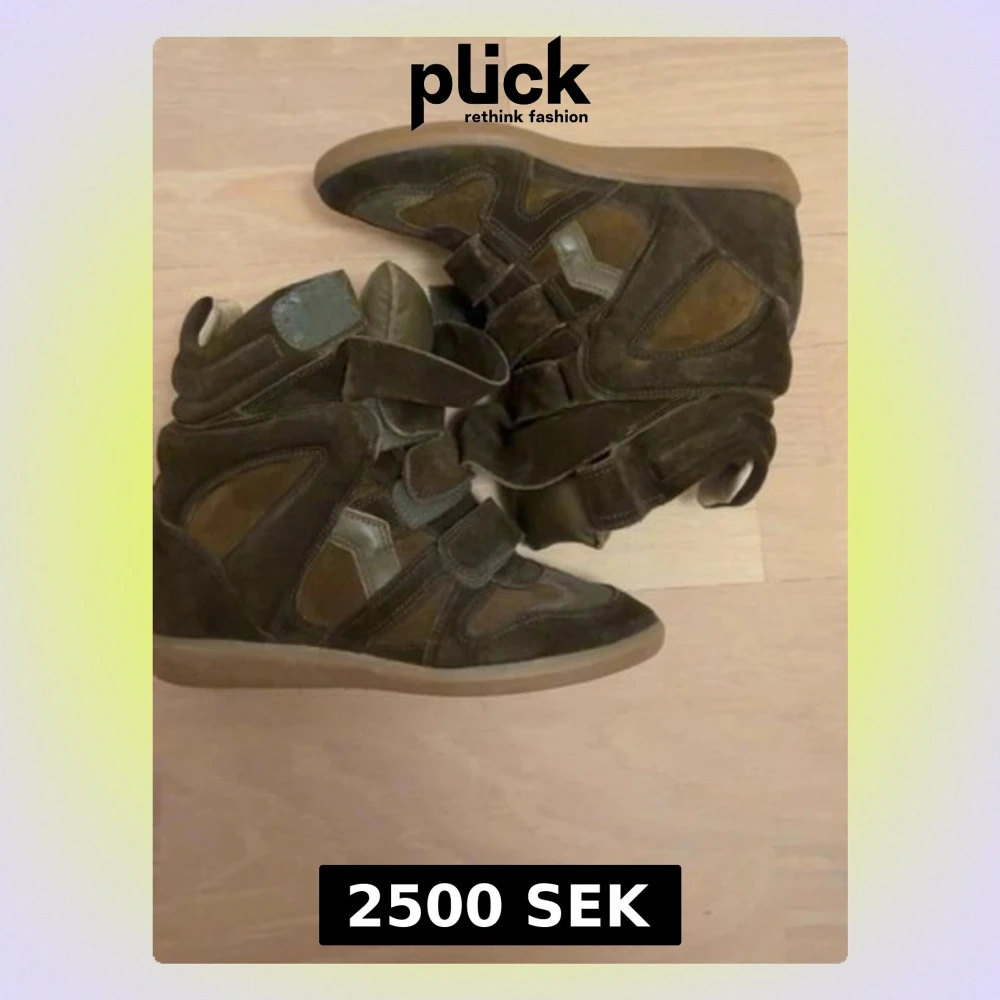 Säljer ett par Isabel Marant wedge sneakers i mörkbrunt och olivgrönt. Skorna har flera kardborreband, rund tå och platt sula. Tillverkade i mocka och skinn med coola paneldetaljer och hög siluett. Perfekta för dig som gillar streetstyle och vill ha något unikt.