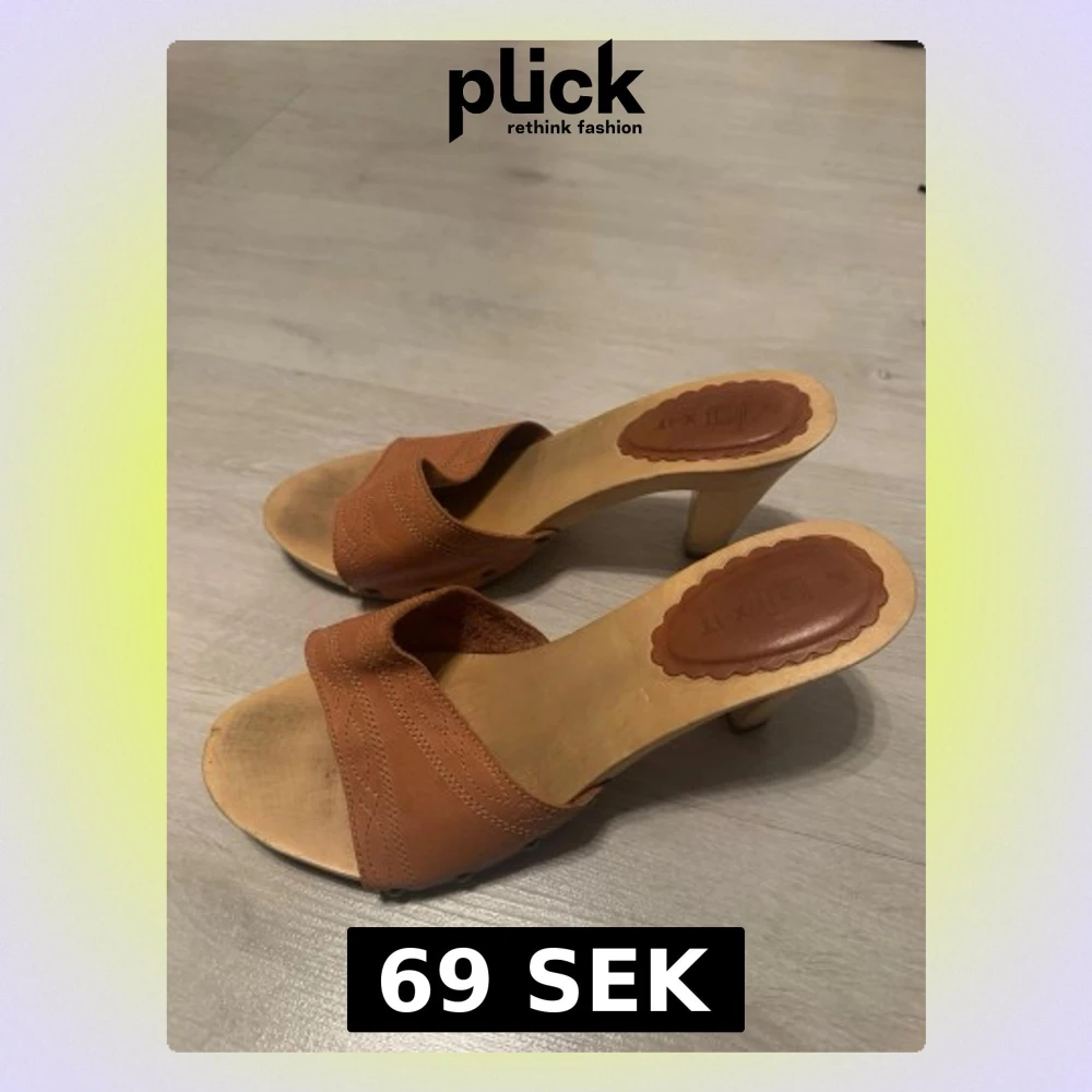 Säljer ett par bruna sandaler med träklack och öppen tå. Ovandelen är i brunt skinn med dekorativa sömmar och nitar på sidorna. Klacken är hög och i trä, vilket ger en retro känsla. Perfekta för dig som gillar en boho-vibe och vill ha något unikt till sommaren.