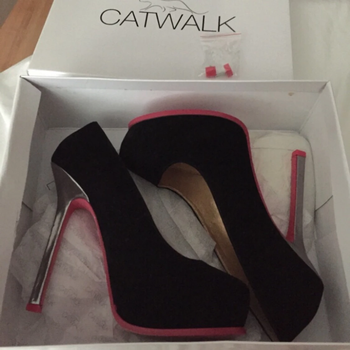 Fina klackskor, med rosa sula och mockaimitation. 10-12cm klack. Extra byte till klacken tillkommer. använda några gånger Frakt tillkommer.
