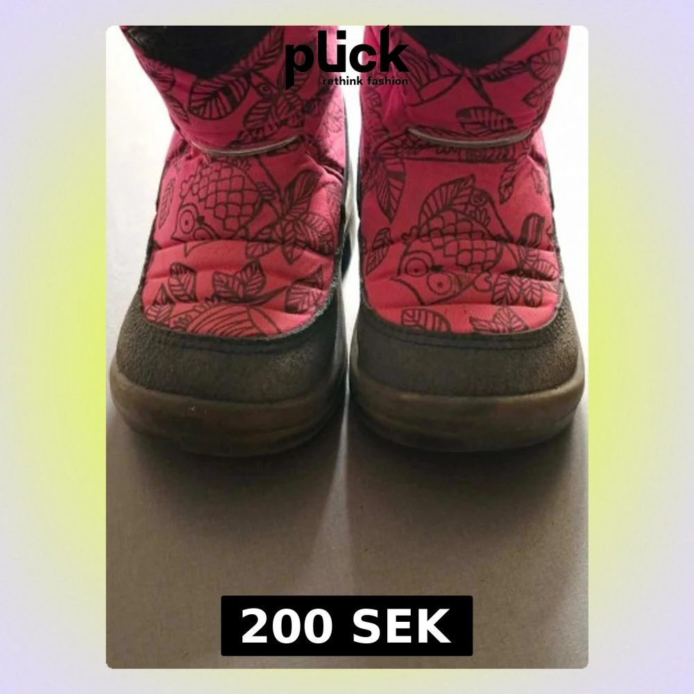 Säljer ett par rosa vinterstövlar med svart ugglemönster och blad. Stövlarna har en robust svart sula och tåparti i syntetmaterial som tål slask och snö. Insidan är fodrad för extra värme och ovandelen är quiltad för en cool look.