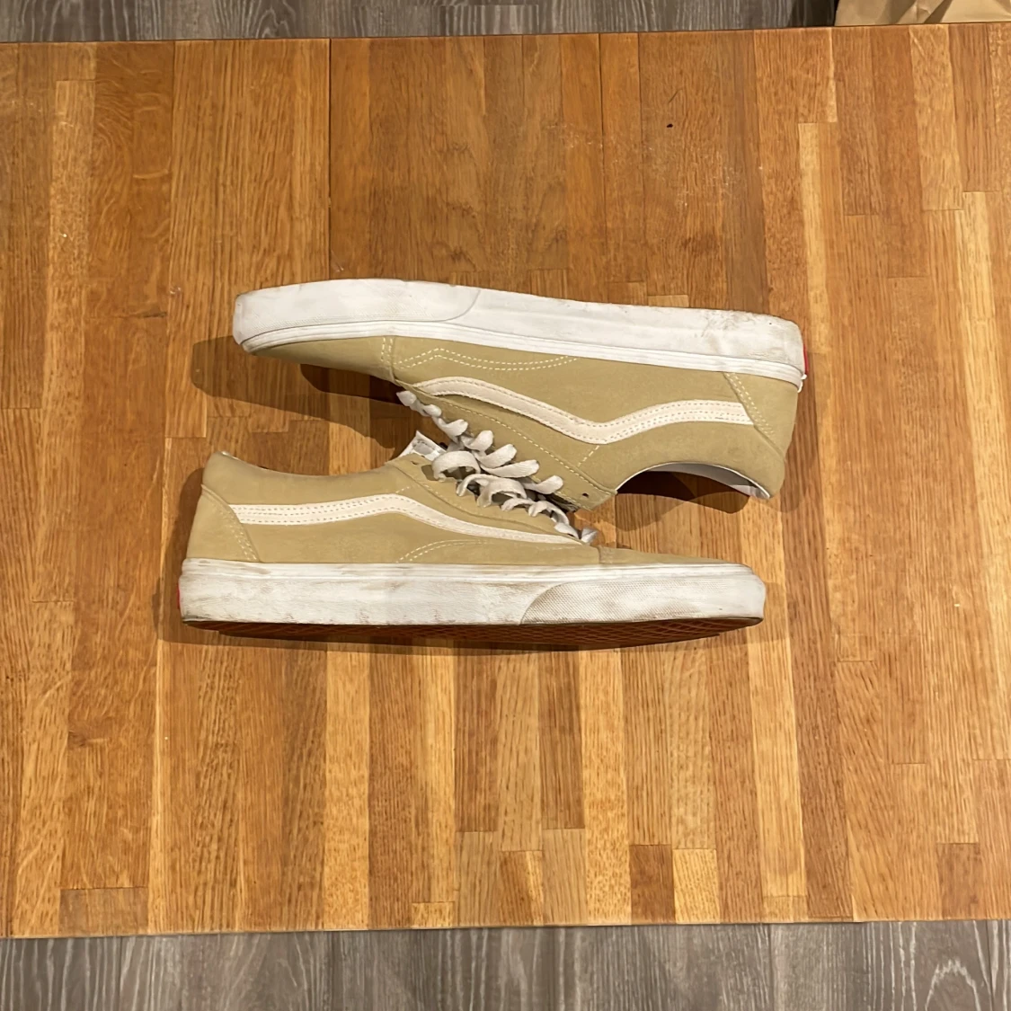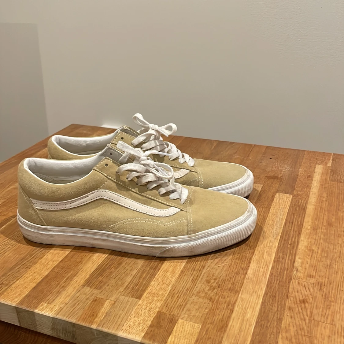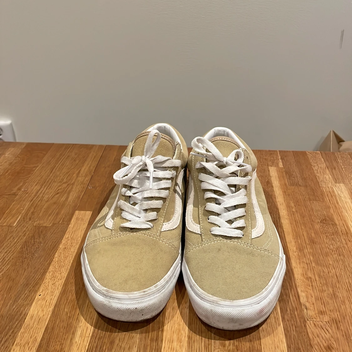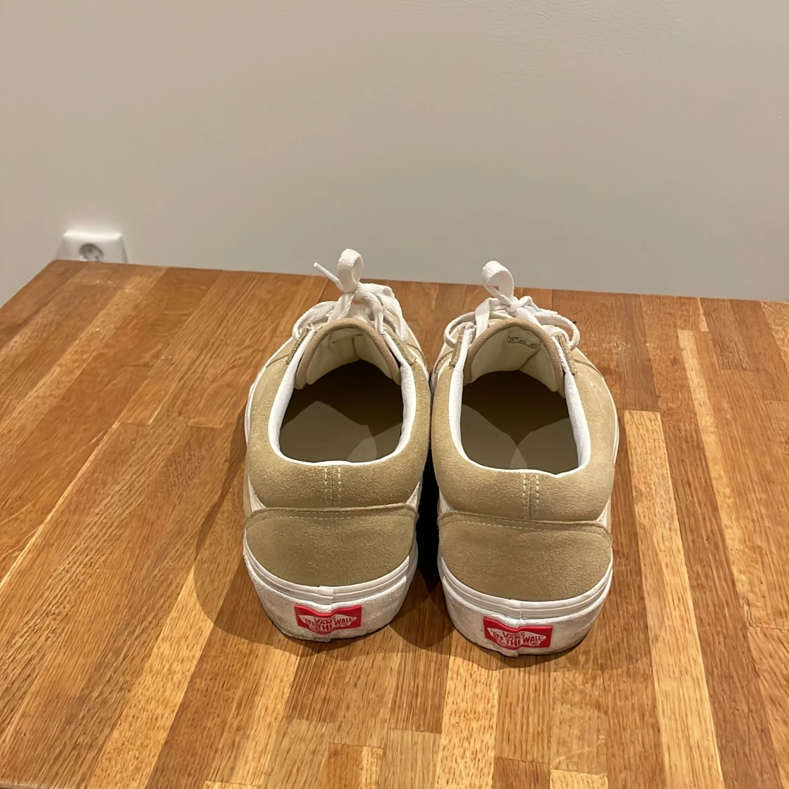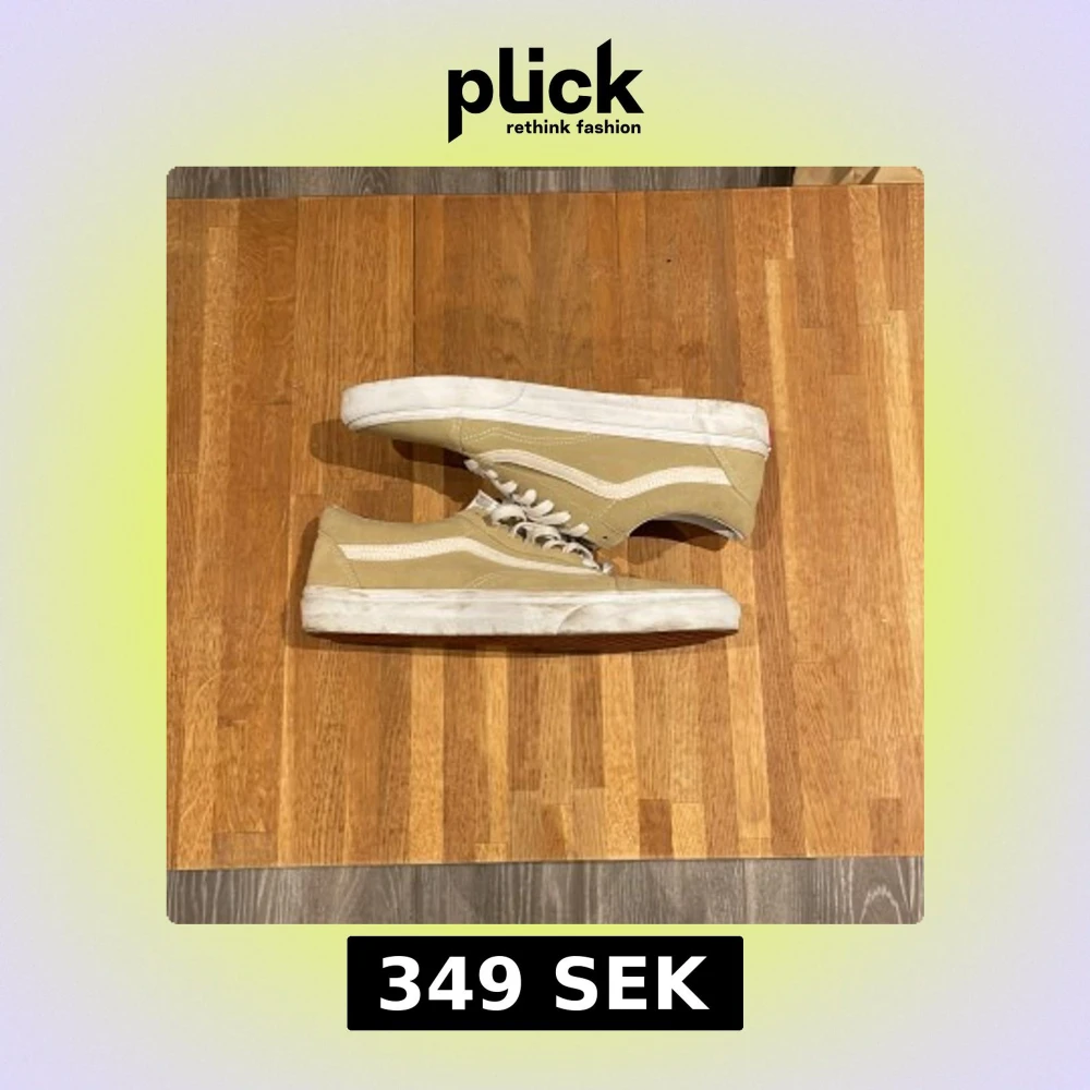 Säljer ett par snygga beige sneakers från Vans med vit sula och klassisk sidostrip. Skorna har snörning och är perfekta för en avslappnad stil. De är tillverkade i mocka och har en bekväm passform.