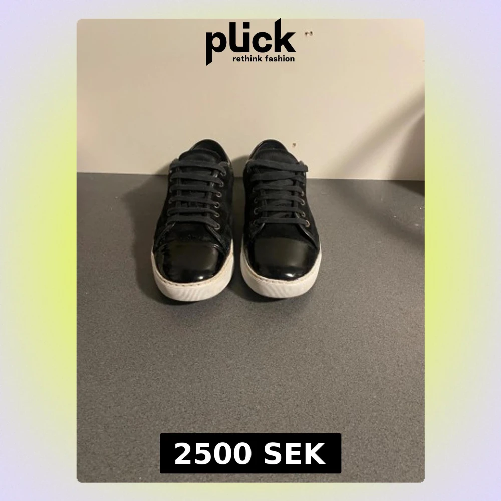 Säljer ett par svarta sneakers med snygg lackad tå och vit platt sula. Skorna har snörning och en mix av mocka och blankt material framtill, vilket ger en cool kontrast. Perfekta för dig som gillar stilrena och moderna skor.