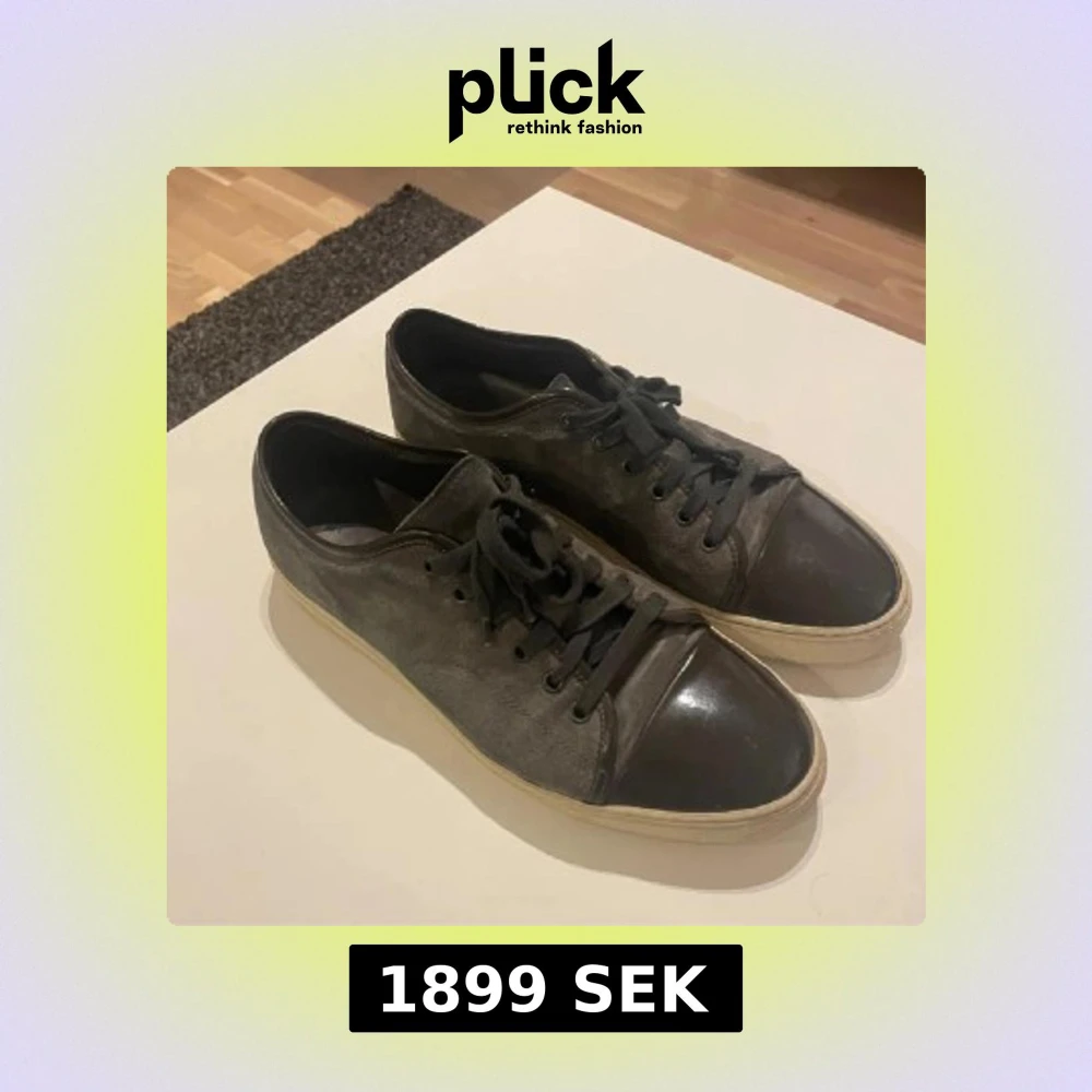 Säljer ett par grå sneakers från Lanvin med svarta skinn-detaljer på tån och snörning. Skorna har vit sula och en stilren design som passar till många outfits.