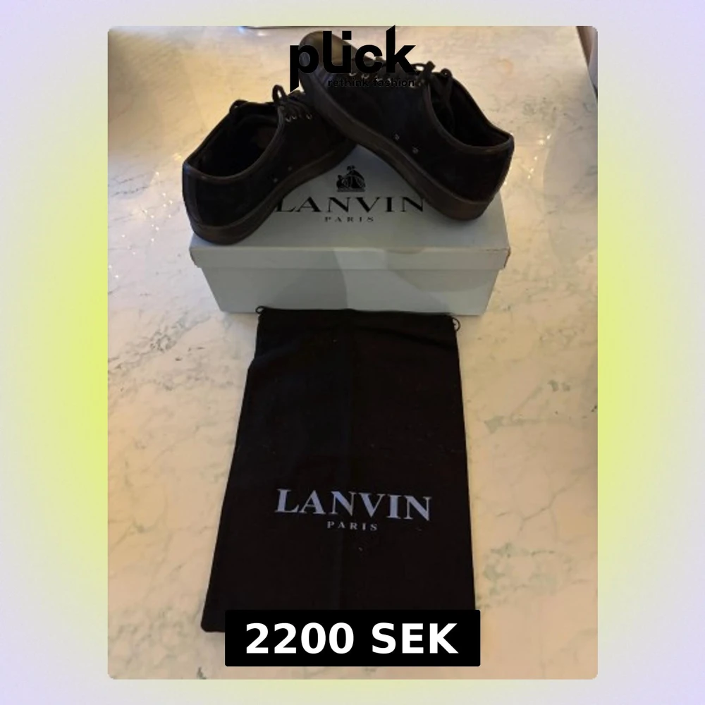 Snygga svarta sneakers från Lanvin Paris med rund tå och platt sula. Ovandelen är i mocka med detaljer i skinn på tå och häl. Skorna har snörning med metallöglor och kommer med originalkartong och dustbag. Perfekta för dig som gillar stilrena och exklusiva sneakers.