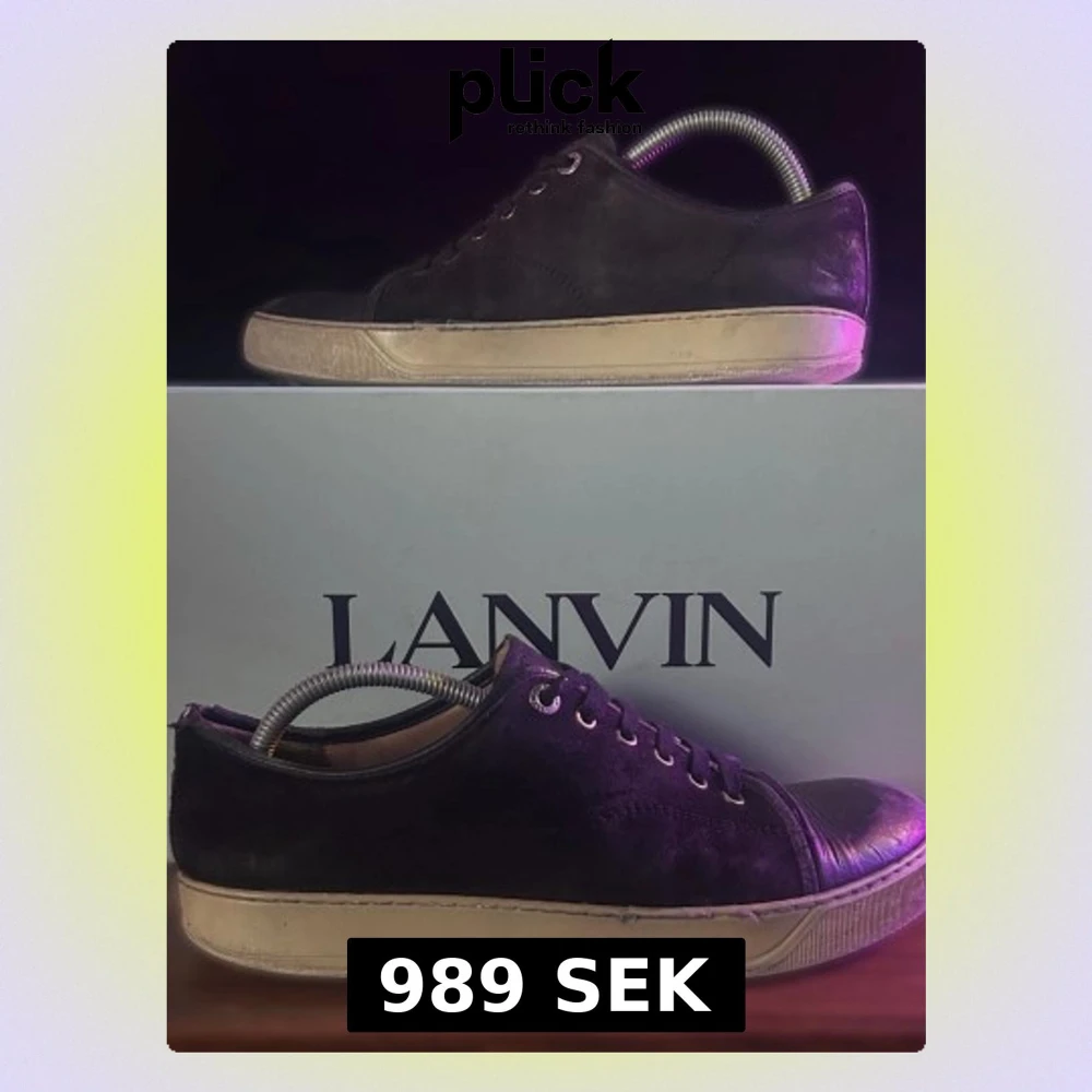 Säljer ett par svarta Lanvin sneakers i mocka med rund tå och vita gummisulor. Skorna har snörning med metallöljetter och en klassisk, stilren design. Tåpartiet är i skinn vilket ger en snygg kontrast till resten av skon. Perfekta för dig som gillar exklusiva och tidlösa sneakers.