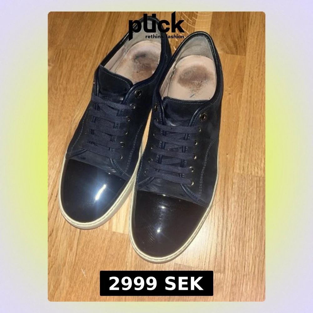 Snygga mörkblå sneakers från Lanvin med ovandel i mocka och lackad tå. Skorna har vita sulor, rund tå och klassisk snörning. Perfekta för dig som vill ha en stilren men ändå unik sneaker med lyxig känsla. Byten accepteras